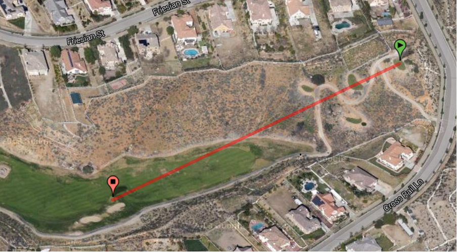 Of course, what's missing is the fact that I am hitting from the top of a hill into the valley below. Probably 70 yards or more of elevation loss, that was the steepest cart path I ever went down. I think I hit a sprinkler head as well, but I didn't really see the ball below the horizon due to the houses that were the same color as the ball. I knew it was my ball because it had my triple mark in sharpie on it.