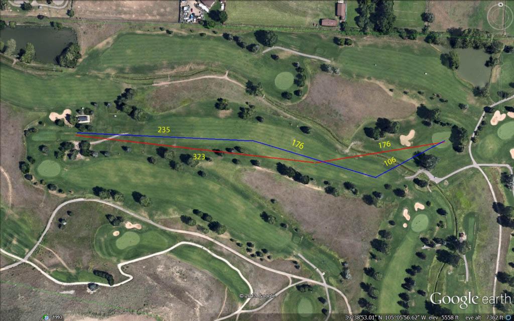 The blue line is how the hole is normally played by most people.  Red line is how it played for me on the best drive I ever hit there.  The blue line total matches the card distance perfectly.  The total of the red lines is about 20 yards shorter.