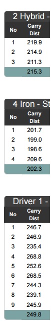 On the range (last 2 weeks), I laser measured the targets and have a "rough average" from 50-100 shots each with range balls (These are the landing spot estimates for carry ):