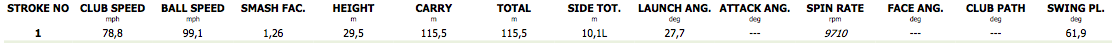 Wow, seeing all these distances... It seems I'm really a short hitter :o. Below my average distances when having a good contact with the ball (not perfect, nor bad shots). I know I lose a lot of distance because I play the ball very high, but doesn't reallymatter. I'm happy with my game and I have gone in 11 months from hcp54 to hcp28,5, so it's not that bad I guess... XD.