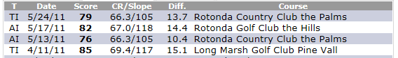 83, 85, 79 last October and 81 first time out last week with my new irons. First time playing with blades since high school (20 years ago) and did well.