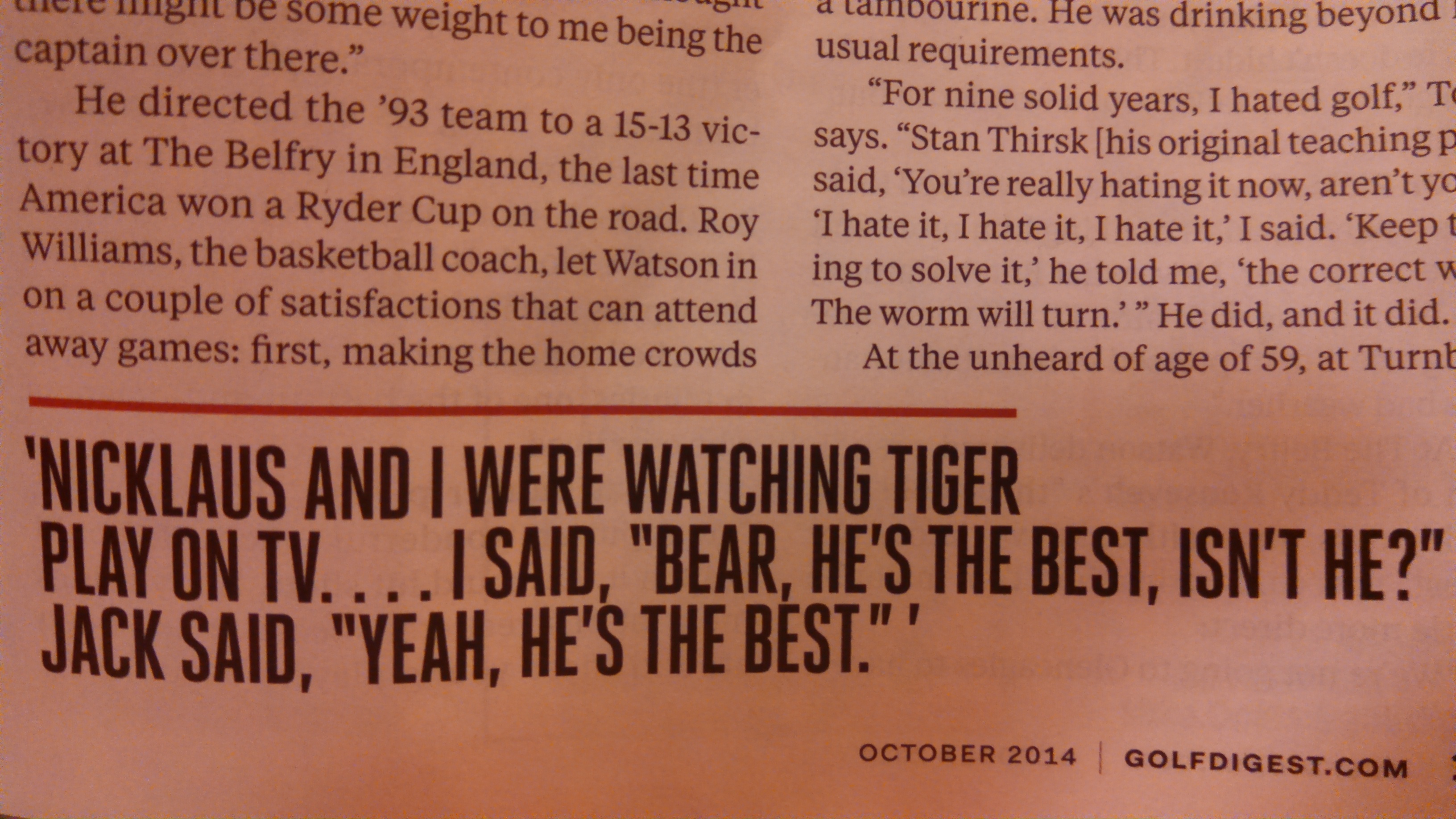 CBS Sports' Kyle Porter gleaned a Nicklaus-Woods nugget from the recent Golf Digest profile on U.S. Ryder Cup captain Tom Watson . In the piece, Watson describes a conversation he had with Nicklaus while watching Woods in action.