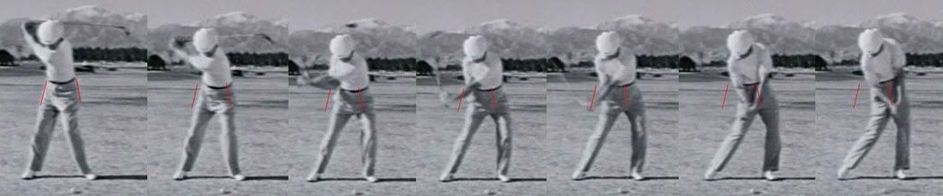 I'd call these positions P1 (address), P4 (top of the backswing), and P7.3 (just after impact). Note that not only does his left hip get forward, his RIGHT HIP is forward of CENTER just past impact. Hogan's head remained steady right up until impact and then he let it swivel forward, through, and up. The green lines on the outside edges show that the frames are aligned.