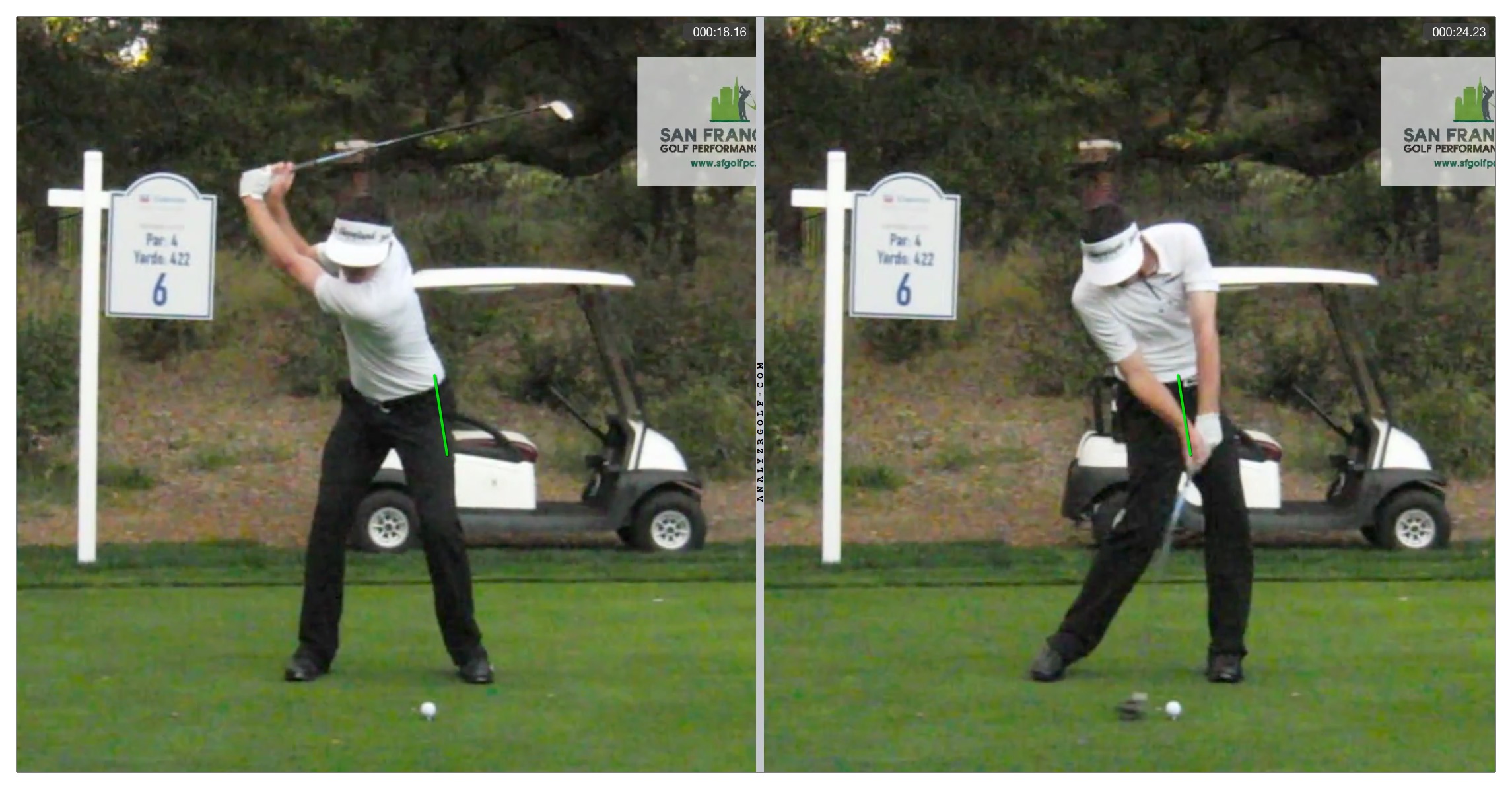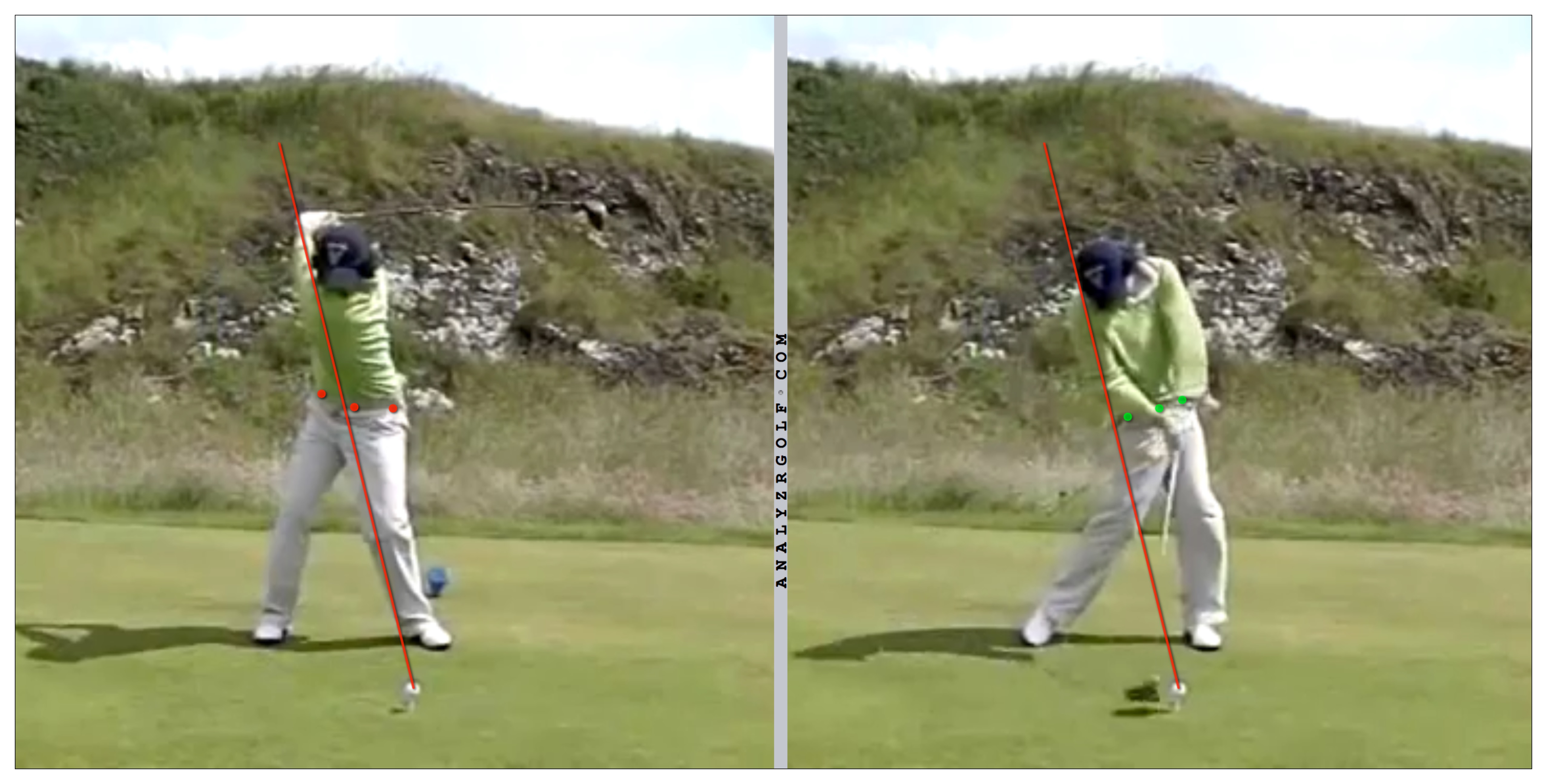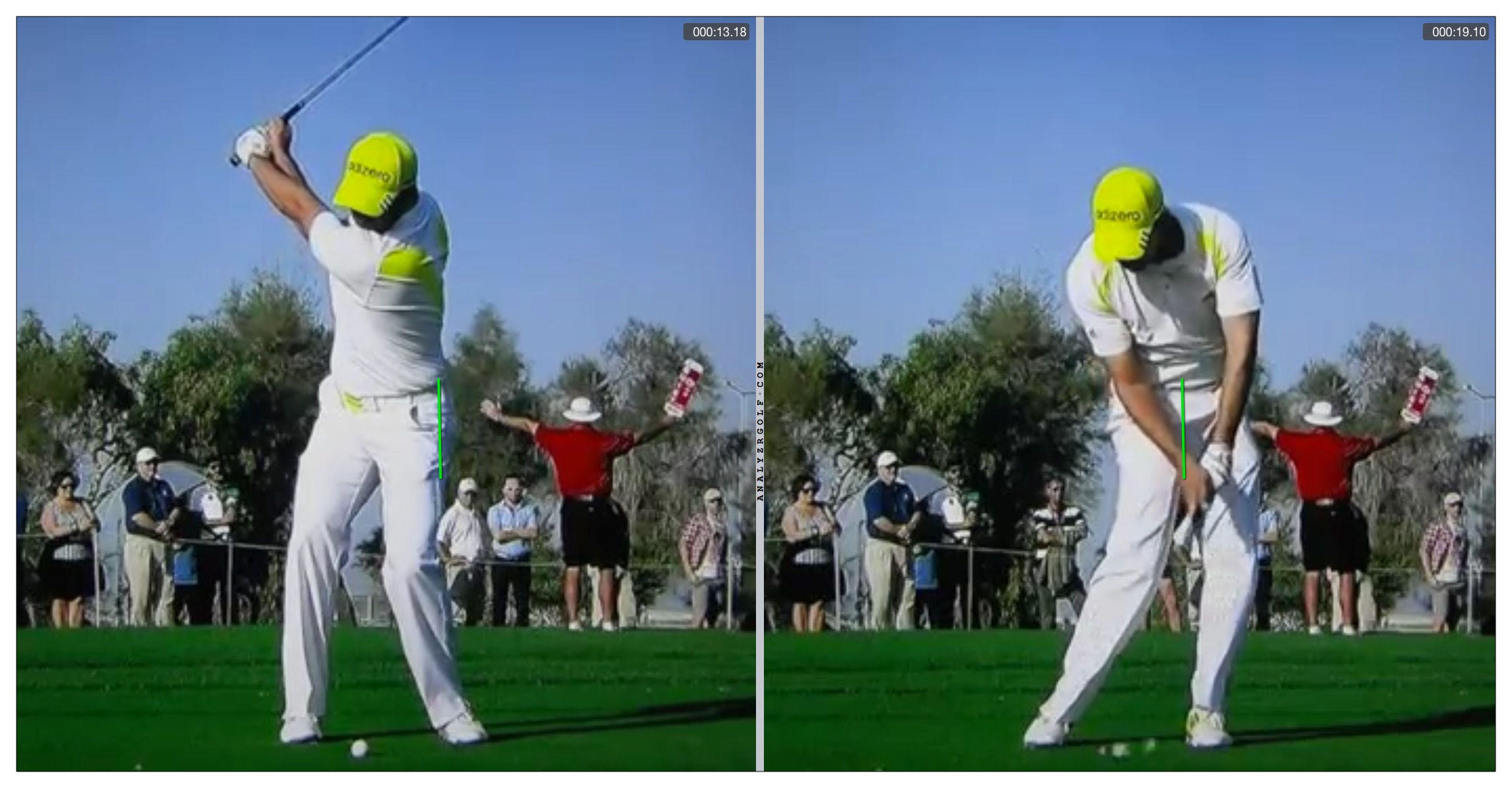 Look at Rory. Red line is his address left hip position. Orange line is his sternum position at address. Green line shows how much his hips have moved laterally from the top of the backswing to about 1/3rd the way down in the downswing. Note hos his head stays steady and the orange line stays on his sternum. Lateral shift does not cause the sternum to move forward. It takes basically just at impact for his sternum to barely move off that orange line.