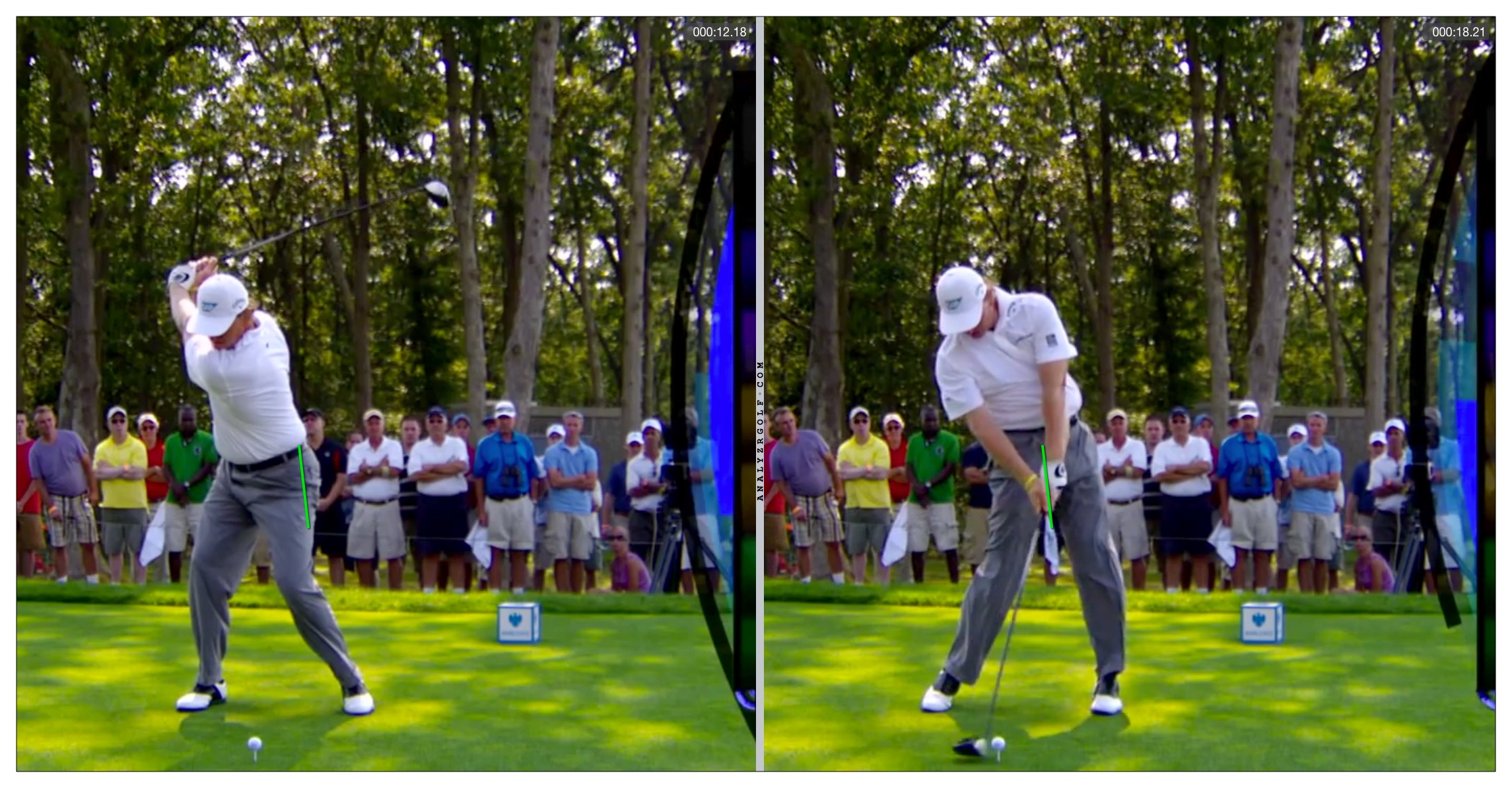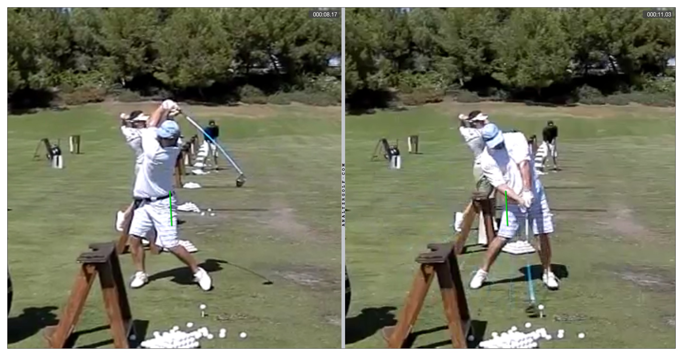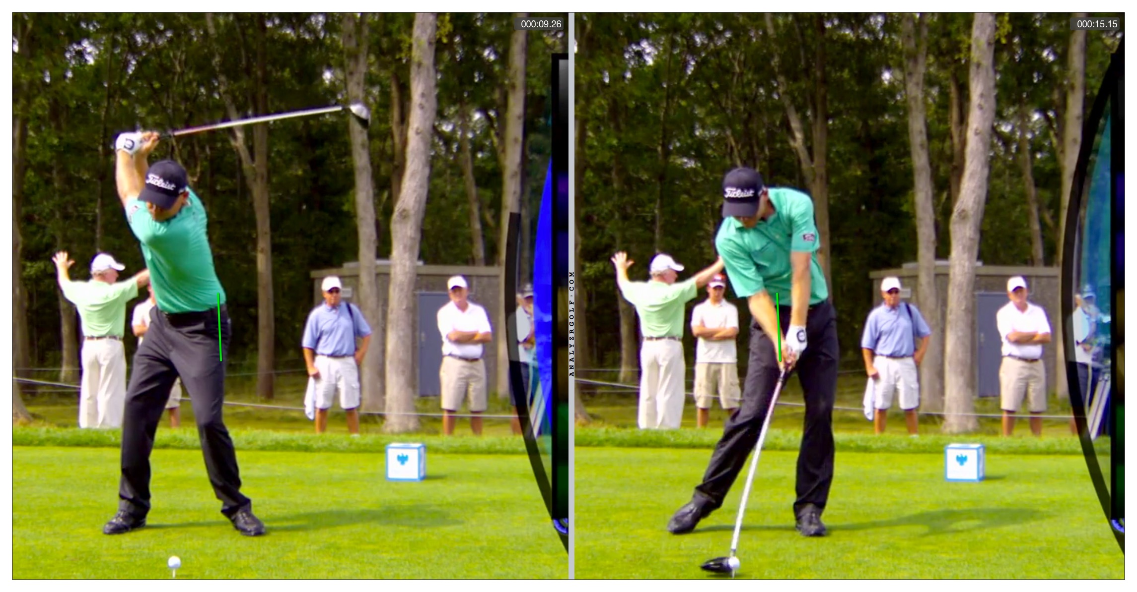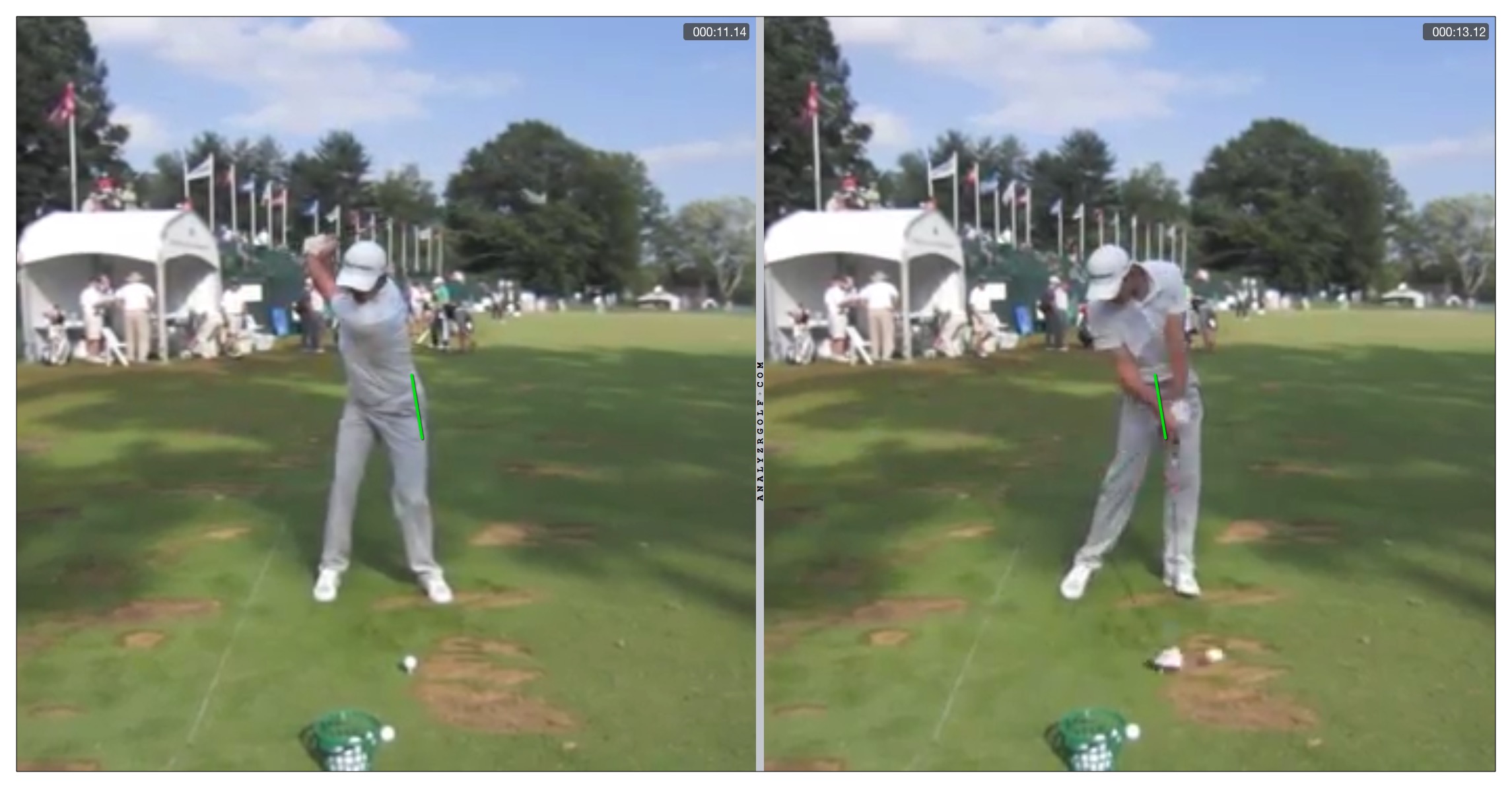 Look at Rory. Red line is his address left hip position. Orange line is his sternum position at address. Green line shows how much his hips have moved laterally from the top of the backswing to about 1/3rd the way down in the downswing. Note hos his head stays steady and the orange line stays on his sternum. Lateral shift does not cause the sternum to move forward. It takes basically just at impact for his sternum to barely move off that orange line.