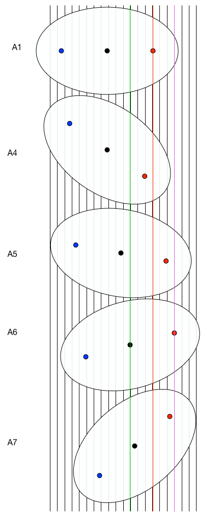 What we can see here is that while the left hip does indeed move backward slightly from the farthest point it gets forward (around A6 here, and typically at about this point in good players), the center of the hips continue forward slightly. Most of the "sliding" of the hips forward occurs before A7 (impact), but part of that is simply due to the amount of time: it's short between A6 and A7 and longer from A4 to A5 or A5 to A6.