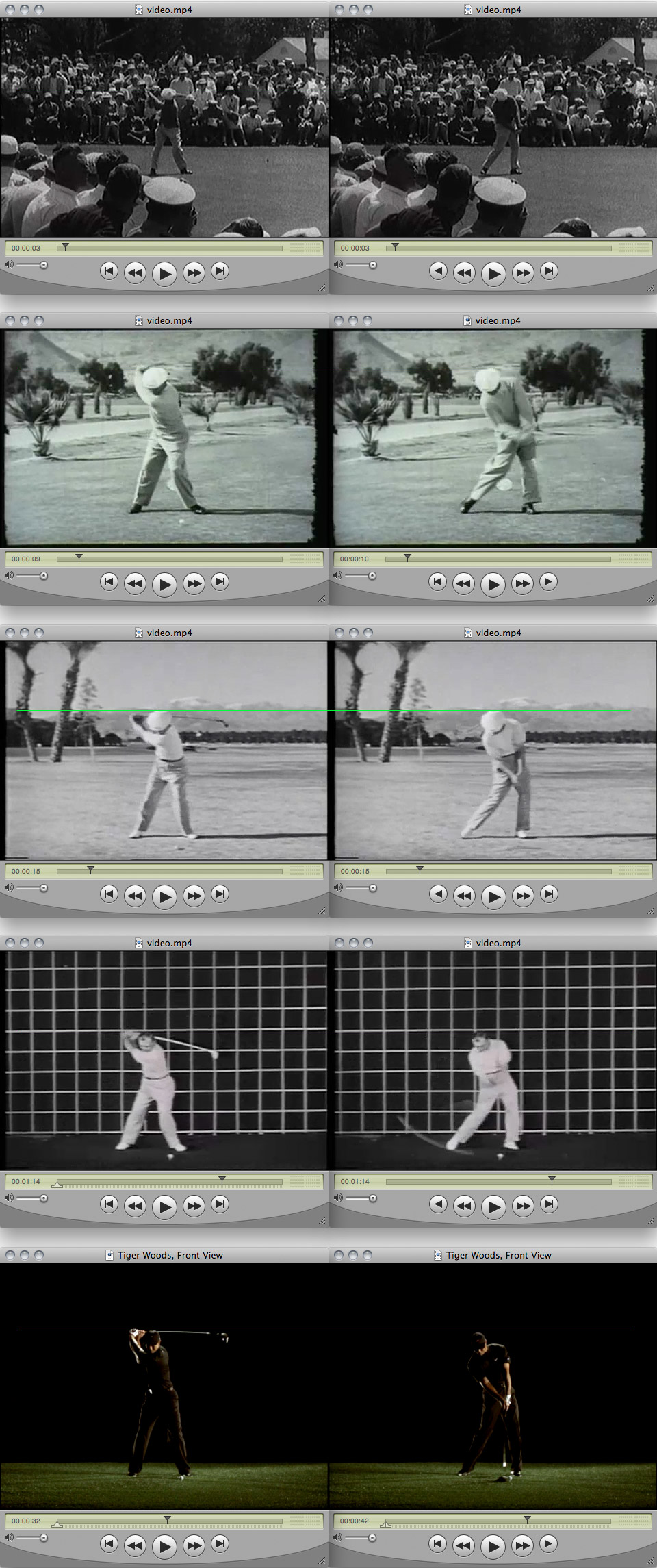Here's Ben Hogan and Tiger Woods . You'll note the distinct lack of a head dropping. Sergio's head drops, but it's a result, not a cause, and is still somewhat unique to his swing. Paula Creamer and Natalie Gulbis drop their heads the most - should we emulate those swings? Not likely... Your head should remain fairly level throughout the backswing and most of the downswing.