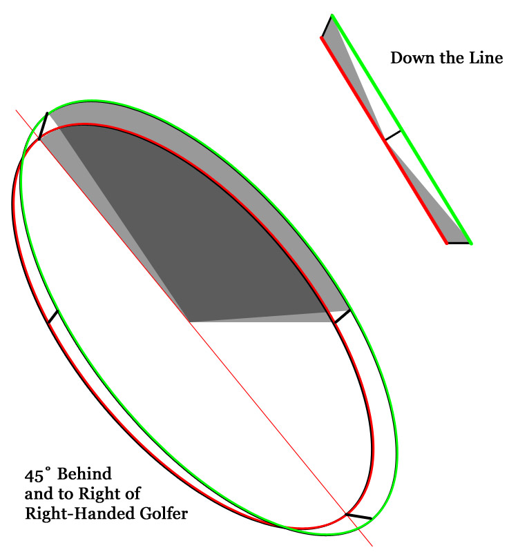 My original intent was only to talk about the club at parallel because a) that's what instructors and TV types talk about, and b) it's early enough in the swing that it's easily checked and fixed, yet I see a LOT of people getting it "wrong." Probably 90+% of golfers don't hit the parallel positions. First let's examine the circular path the club travels on. The top of the backswing puts the shaft at roughly 270° from its starting position. 180° or so of that is rotational (the arms about a swing center roughly between the shoulder blades). We know this because the left arm moves from straight down (and right) to straight up (and left) when viewed DTL. The left arm moves roughly 180°. The other 90° to get the shaft parallel at the top comes from left wrist cock, right-elbow bend, right wrist folding, and the gap between your hands. I'll talk about those later. I made a long golf club out of pipe cleaner to help me visualize all of this. I constrained the angles to 45° for simplicity. If you swing this imaginary (or real in my case) club exactly on the plane, the leading edge changes from toe horizontal to toe vertical (or "toe up"). At parallel going back the leading edge will be 45°. This makes sense because the clubface is always perpendicular to the shaft, and thus, always perpendicular to the plane, or square to the plane. So long as we only rotate the club on the plane and around the point between the shoulders, it will always be square. The clubface marks is effectively the tangent line of the inclined circle. The toe and the heel trace circles about the same center, but because the toe is farther, its circle is larger. If you draw this out, you get something like this (in 2D DTL and 3D from an angle): What's clear to me, and is easily seen in the DTL view, is that these concentric circles could be viewed as a cone with two inscribed circles. In 2D, that's a triangle, but in three dimensions we have a cone. The cone is resting on its side so that the leading edge of the clubface is flat at the bottom of the swing (i.e. your club is properly fit). Here's another way to look at it: a good video on YouTube demonstrates this idea in another way that may help you conceptualize this. I took still frames from this video at "address" and the backswing and follow-through (it doesn't quite get to parallel, but you can see what's going on): So why doesn't the clubface in Zeph's image match the lines I've drawn to represent the clubface in my diagram? The reasons I said we'd get to later: the right elbow, the left wrist, the right wrist, and the gap between the hands. The right elbow folds. In the image Zeph included, that's illustrated nicely. When the right elbow folds, the plane gets steeper. If you take either of the cones (2D or 3D) and rotate them so that the plane is steeper (i.e. the toe would be down more at impact, or "clockwise about the tip of the cone or triangle as viewed down the line"), you can see that this changes the angle of the leading edge of the clubface. It's no longer angled up as much - it rotates the angle clockwise (from the heel end), as if going from 1:30pm to roughly 3:00. (Note: If your right arm separates from your body, that also effectively steepens the plane. I consider that a corollary to the right elbow folding - they accomplish the same thing in this discussion.) But we still need to get to roughly 4:30. And we do that with the second part - the left wrist cocking. The left wrist cocking swings the club another ninety minutes or so, from 3:00 to 4:30 (again, roughly). This move will put the leading edge of the clubface (in 2D and from the DTL view) on the same line as the back of your left wrist and/or left forearm (assuming a fairly neutral grip, of course). Unfortunately those aren't the only moves we make at the top of the backswing. If we only did those things, the club would leave the surface of the cone and point towards the middle of the cone - the shaft would start pointing perpendicular to the plane instead of riding on the plane. Try this drill: hold a putter in an address position. Cock your left wrist up as much as you can without doing anything else. Where does the club go? It swings straight up in front of you, perpendicular to the plane of the swing. So what gets the club pointing down the target line? A combination of the right wrist folding, the separation of your hands on the club, and a little bit of rolling (because of the right wrist folding). The folding controls the rolling. Here's a video of Ryan Moore. Ignore Peter Kostis and look at his swing. The club stays way out over the plane with the shaft almost perpendicular until the shaft "lays down" because he rotates when his right wrist folds at the top: