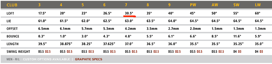 A current TM set: 7I - 30.5 degrees, 37 inches. See http://taylormadegolf.com/taylormade/rocketballz-irons/DW-JN522.html