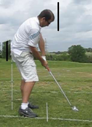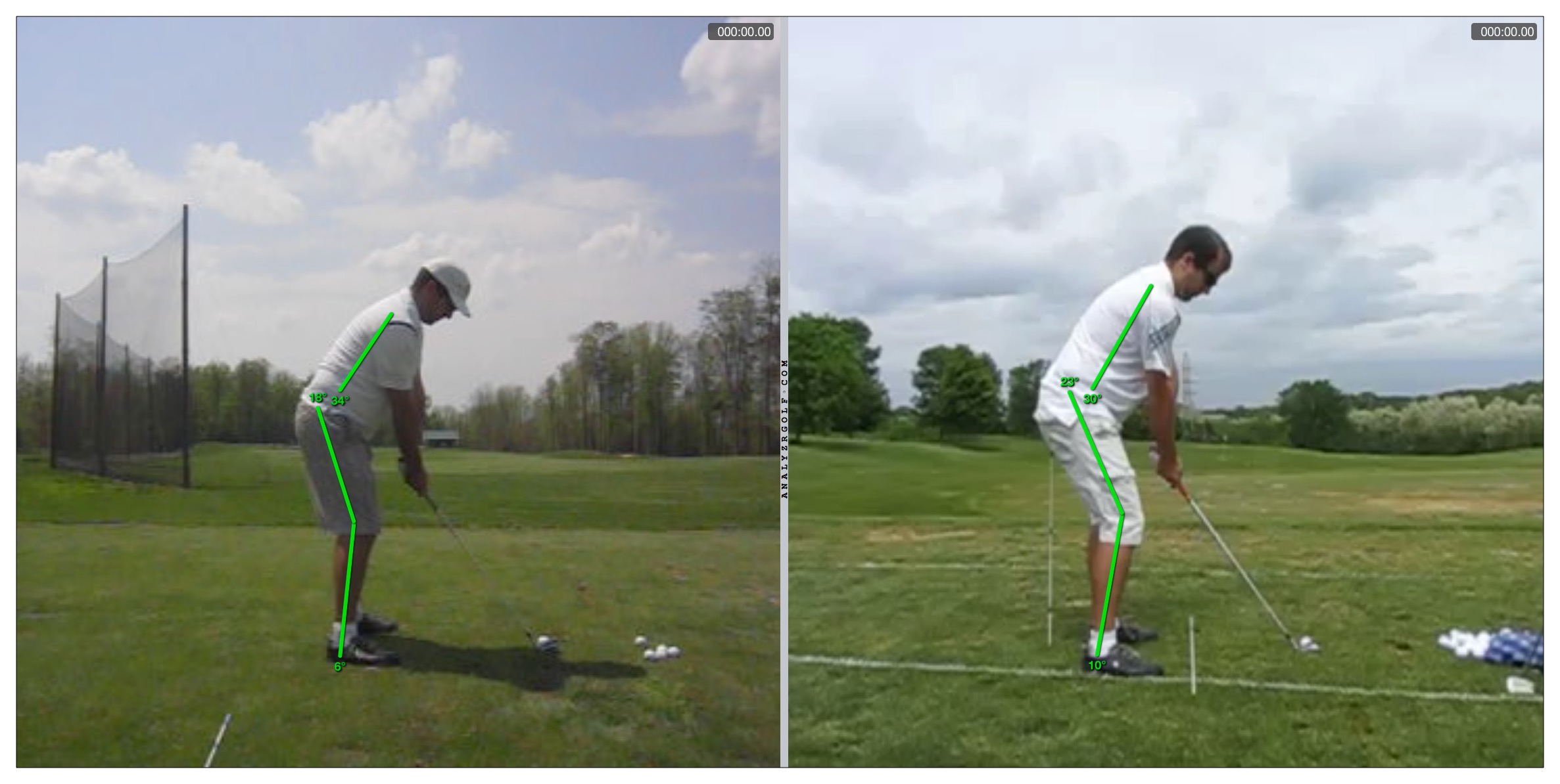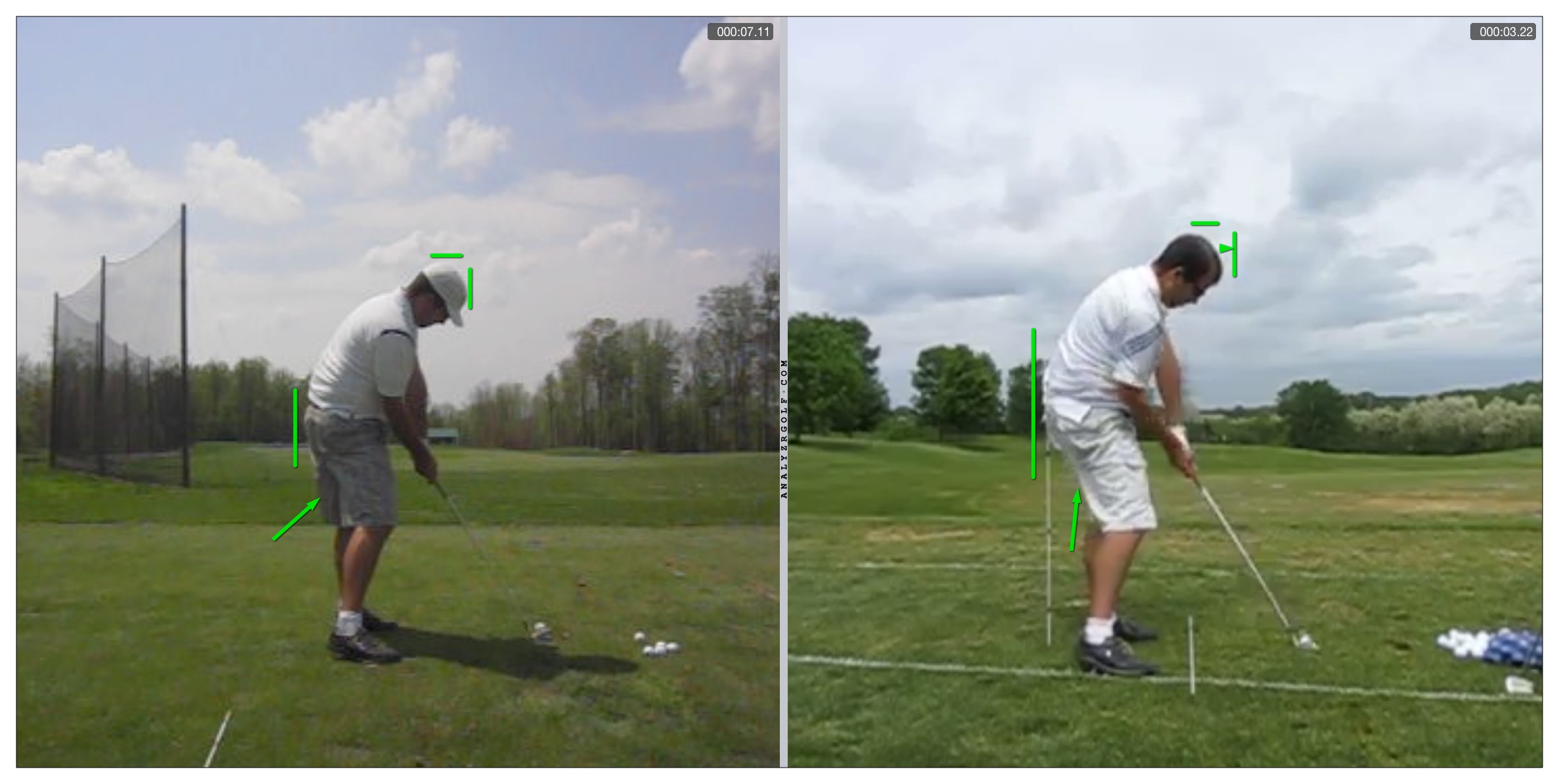 Image on the left, hands are not far enough out towards the ball. Image on the right there is my classic loss of spine tilt. Though this are not closed and the shoulders are square to the target line. I think I am combining getting the hips open with loss of spine tilt instead of fixing both. I would presume that I would be stuck in the amount I can get my hips open if I continue to struggle with the spine tilt thing.