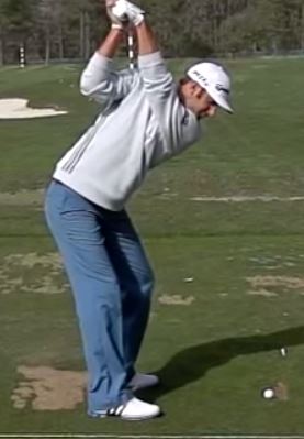 Compared to Dustin Johnson who doesn't have the butt towards the ball move early in the swing. Really from here it would be hard for DJ to do the move that is in my swing. If he rotates from here, the hips have to backward, up and around.