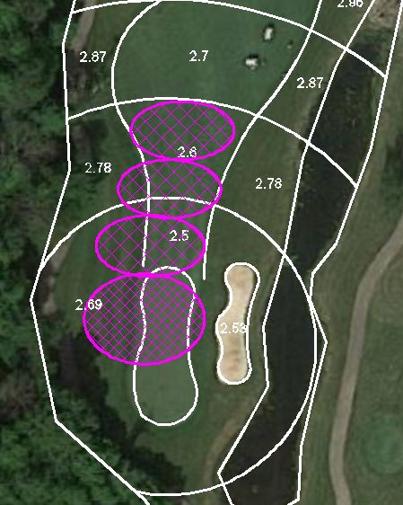 Another key factor is that their is a big bank to the right of the green that kicks the ball left. So maybe a good percentage more might be fringe or on the green than the 50% coverage area. So maybe closer to 2.20.