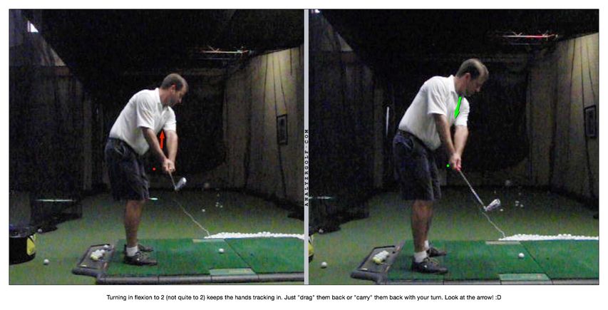 The reason I think this is because when I hit some of my better shots, last two holes. I decided to think about turning in the backswing, but just feel like I lift my hands up. I hit a flush 9 iron to 12 ft on a par 3. I hit a pretty good drive on hole #9, the ball started center of the fairway and draw'd to the left edge of the fairway. Earlier in the round when I was trying to hit my driver I felt very early extension feeling as well as tipping back feeling on some.