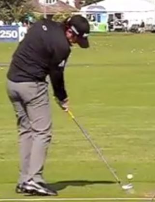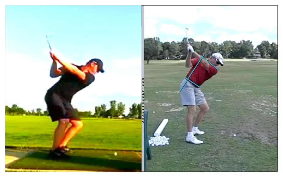 At impact your hips should be more open. Try to focus on getting your left hip to fire around and up. See how flat your hips are, and how your right knee kicks out. You need to get more extension in the legs and get your belt buckle pointing more towards the sky. Check out Rory on the right. See how his back heel isn't as high off the ground, and more open he is. He's gaining extension into the finish. Check out the video bellow for more on this.