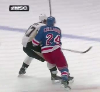 And the call on Sid later in the game on - of all people - Sean Avery? For a "tripping" call that wouldn't be penalized in an adults vs. kids game? Get real. It wasn't a slew foot. It's a hockey play, and it happens - and goes unpenalized - several times per game, at every level of the game. Callahan initiated the contact, was called for interference, and Sid was trying to regain balance and put his right foot down. There's no follow-through, there's no kicking or sweeping. Plain as day.