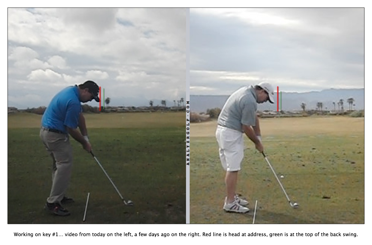 As far as the Key #1 stuff, I am having the same issues.  I'm extra special though, because I have 3-dimensional Key #1 issues.  My head moves TOWARDS the target on the backswing, and away from the target AND off the wall on the downswing.  I am pretty sure I'm close to cleaning up the swaying part (basically by feeling like I'm actually moving my head back a little during the backswing, I am able to keep it from tipping forward.)