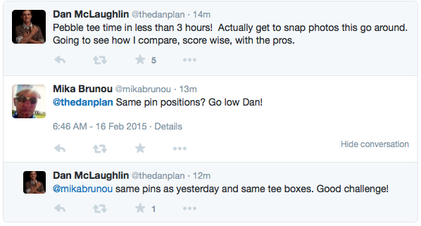 That's pretty cool! Dan will play Pebble Beach in a couple hours, with same tees and pin placements as yesterday's final round. That's a once in a lifetime opportunity. Talk about a decent benchmark to compare yourself against- this should be a decent way to evaluate where he stands today (admittedly rusty from the winter though). Think we'll get a score from it? Maybe he'll turn on his Game Golf module, or track it via his GolfShot app. We can hope.
