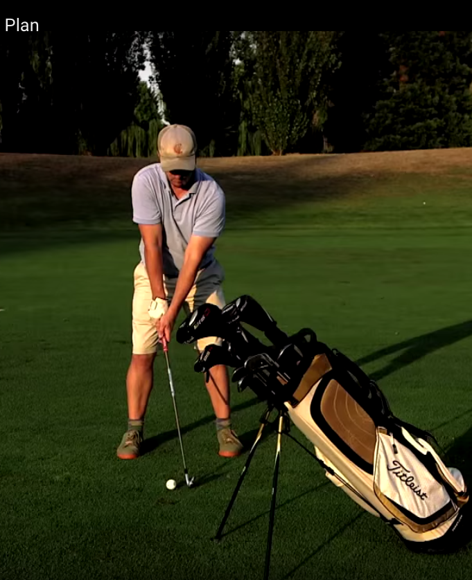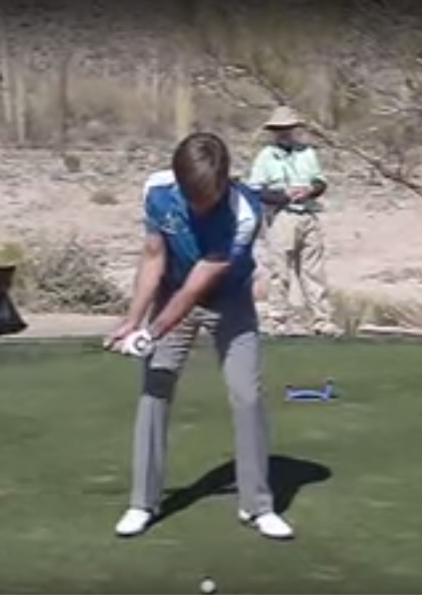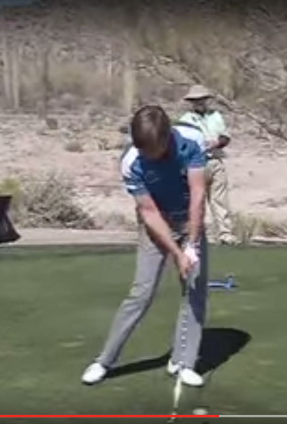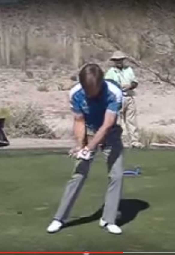 Good point. In his blog narrative the past couple months, Dan also has made multiple references to either an "armsy-fade" swing versus a more hips-driven "draw swing." With his back issues, he has been mainly using this armsy swing (as he calls it), just to relieve pressure. In the comments section, at least one person has asked if this is wise and creating bad habits. A few seconds before this shot, he told the camera that this was a 7-iron that would cut back to the hole.  He also said "by this same point in the season other years," this would be an 8 or 9-iron for him. We are left with the inference that his back is inhibiting him from really going after it.