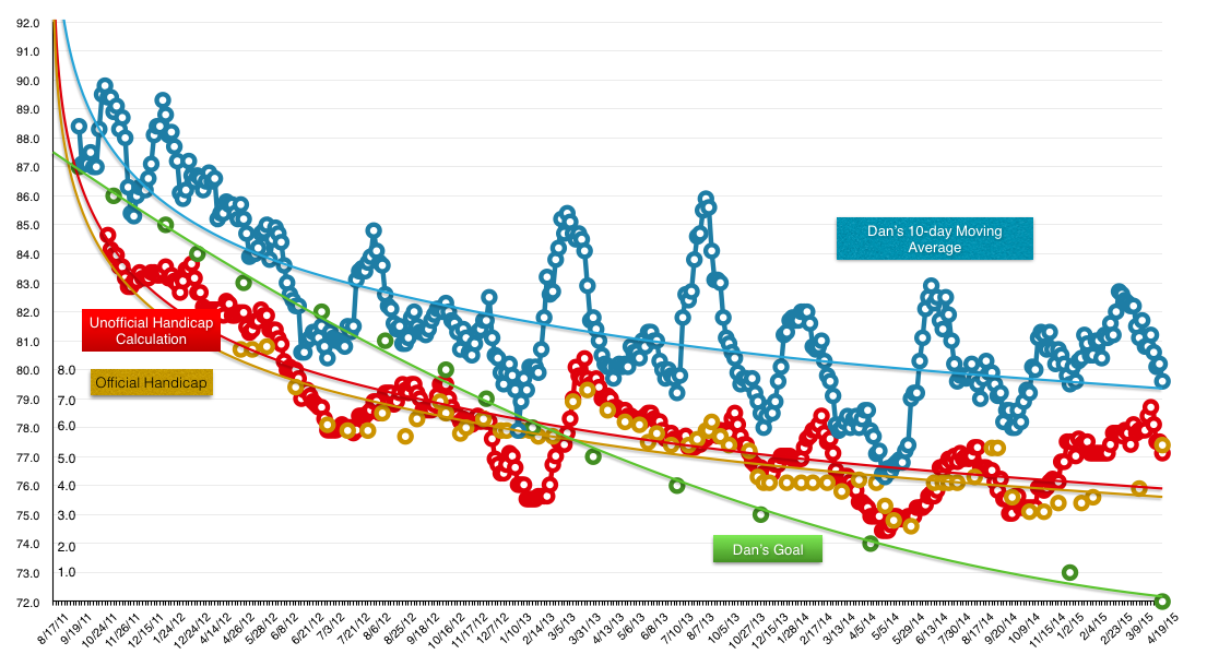 In Jan 2013, he had some scores that brought his 10-day moving average down to his goal, but never again.  In fact the trend line for his 10-day moving average never really got close to his goal. Just squint and focus on the smoothed green and smoothed blue lines. They diverged nearly from the start.