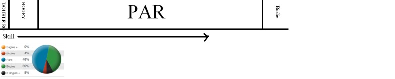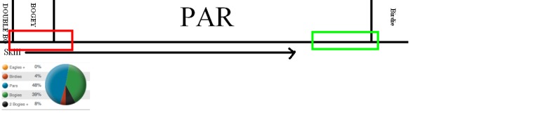 Imagine someone who consistently shoots scratch, they are just as likely to make a birdie as they are a bogey, or two birdies as they are a double. Now look at Dan's numbers. On any given hole he has a 48% chance of making par, 39% chance of making bogie, 8% chance of making double and a measly 4% chance of making a birdie. (less than one a round) A 6 handicap sounds nice but it is masked by that catch-all par monster. It hides that fact that Dan is nowhere near scratch. Currently on any given hole he has a 47% chance of bogie or worse and only a 4% chance of a birdie. There is a huge difference between a bogie and a birdie. There isn't going to be a rapid conversion of bogies to birdies and the reason is that huge amount of skill required to span that bogey to birdie stretch.