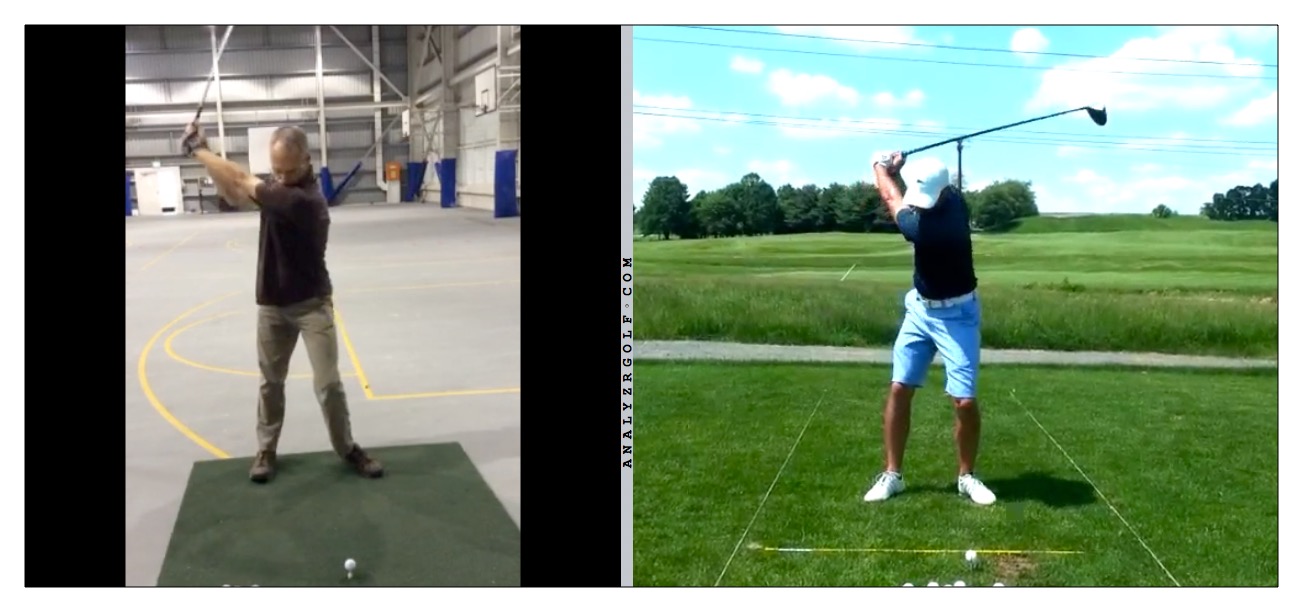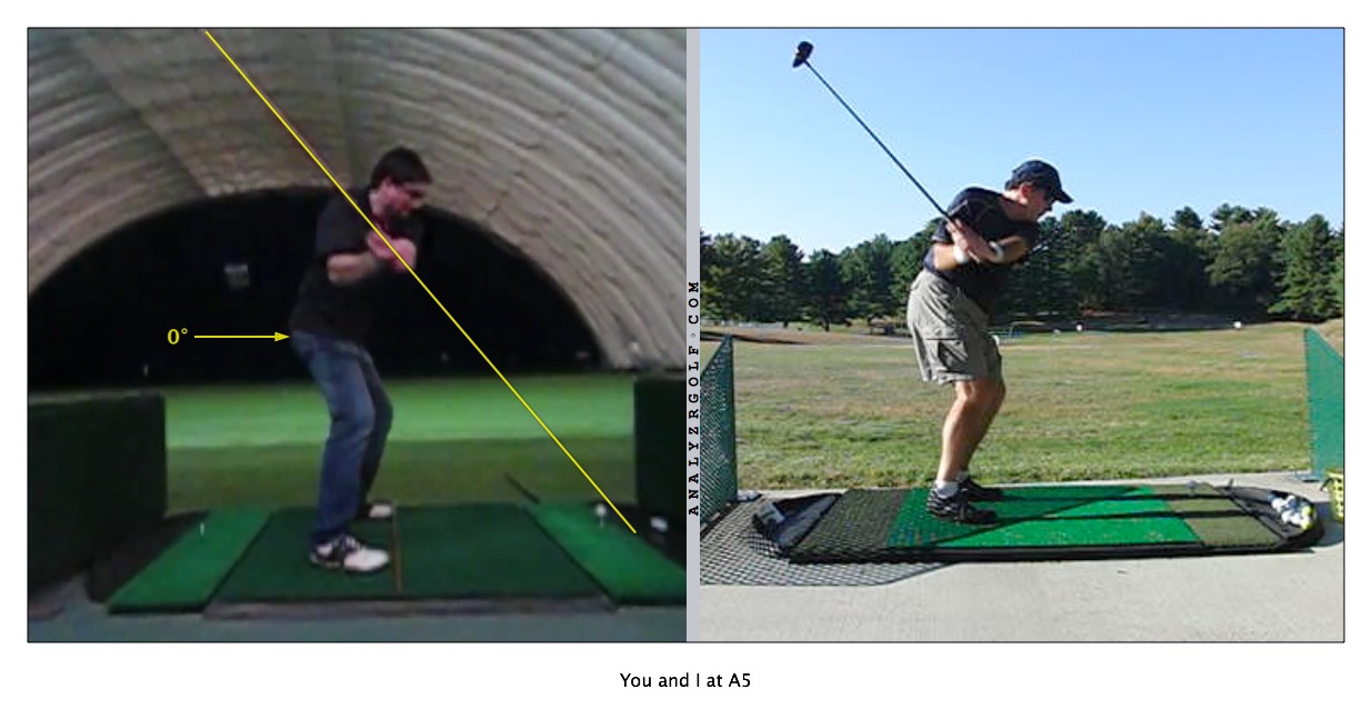 I can't tell from the DTL view, but how is your Key 2 doing?  Erik pointed out to me that Key 2 will help Key 3.  Try the swing with a Key 2 thought and see if it helps the A6 position.  Here are you and I at A5.  Notice both out hips are still closed.  Your right foot is still planted, which may indicate your weight is still centered and hips are centered when they should be more forward.  My transfer has started, but it is not enough (got that from my lesson).  My shaft is too steep as well.