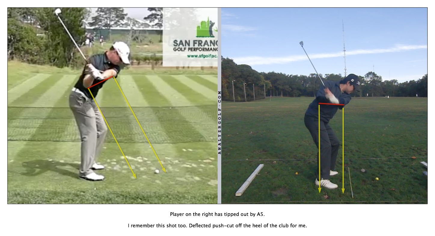 The submarine pitch is another awesome feel for this too, good reminder. I was actually thinking of it yesterday to be honest. Works pretty perfectly with it.  [rule] It really is amazing how important elbow positioning can be for controlling swing path (punch elbowers notwithstanding). Check out the difference between me and Zach Johnson here: [URL=http://thesandtrap.com/content/type/61/id/96399/] [/URL] Zach's elbows are basically "aimed" at the ball, and now the entire arm package can travel outward and diagonally as well.  Meanwhile, check out the idiot on the right (me). The elbows are basically straight up and down. It's no wonder that when I played really badly, I get really steep.  So, gotta feel like that right elbow stays under and pitchy. Submarine throw it.