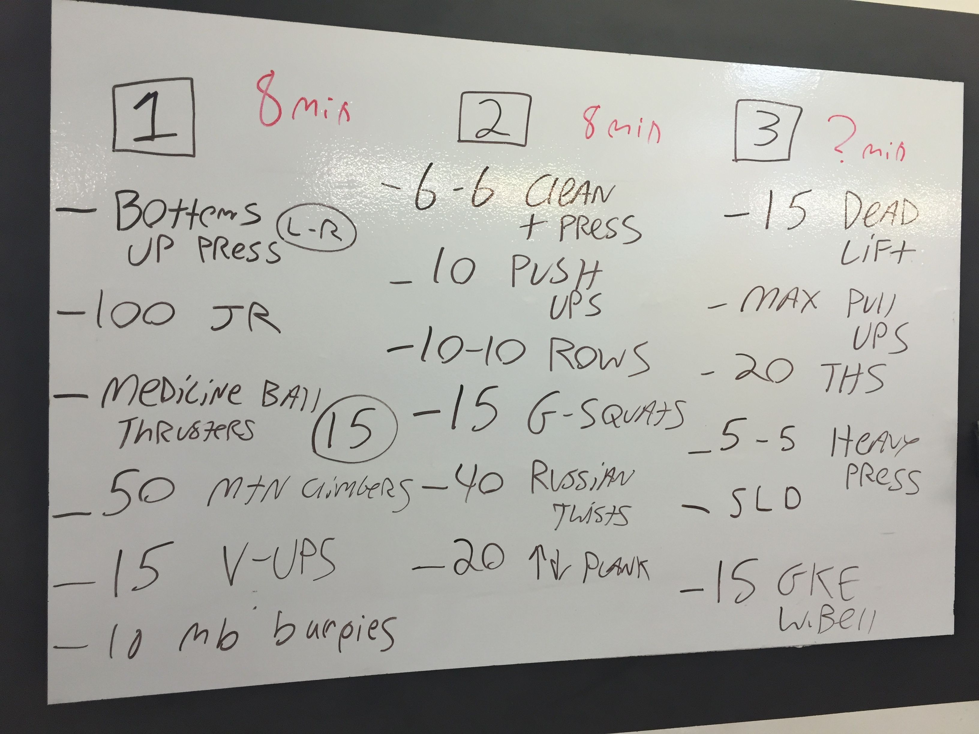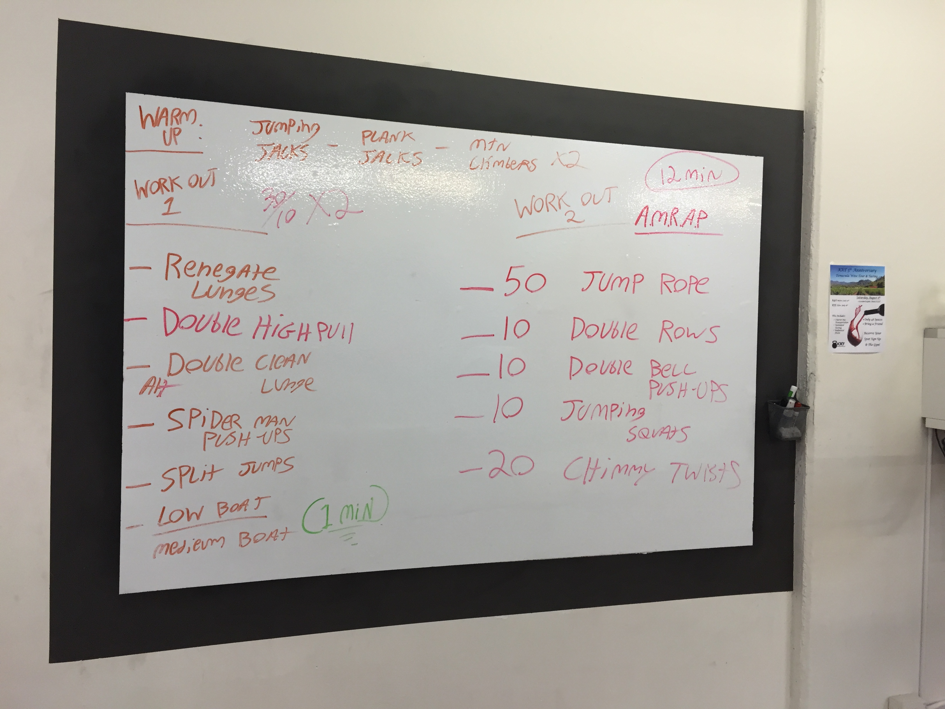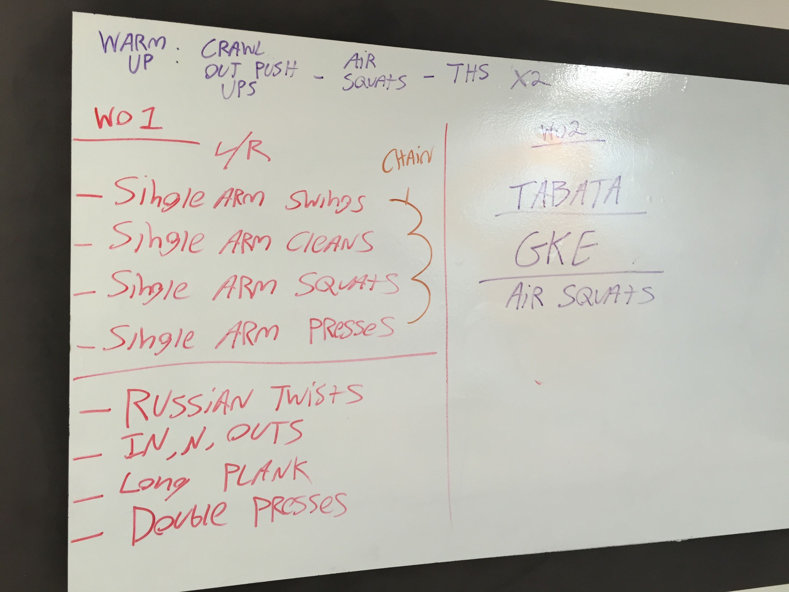 That's the workout posted at my kettlebell gym. All the stuff in the first workout was done with a 24kg kettlebell. We do both workouts in 45 minutes. The workouts are tabata style. For the first workout each movement was 15 seconds, so 60 seconds left arms, 60 seconds right arm without putting the bell down. And then the second part was 30 seconds each with 10 second breaks. We did that twice then moved on to workout 2 which was two 4 minutes tabatas (8 rounds each, 20 seconds on, 10 second rest) of grounded knees to elbow and air squats.