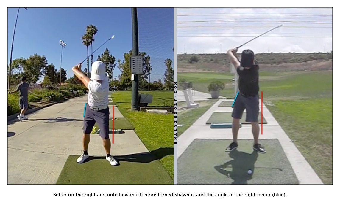 No the right pic is the after pic, the good pic, reason why it says "Better on the right".  The right hip is deeper in the right pic.  Remember what we talked about, right hip to the median line(tailbone).  Deeper doesn't mean sliding more to the right.  Extension (without enough turn) will work against you keeping the elbows together or the right elbow in front of the shirt seam.  We've said this a few times.  Basically you need more Zach Johnson and less Colin Montgomerie.