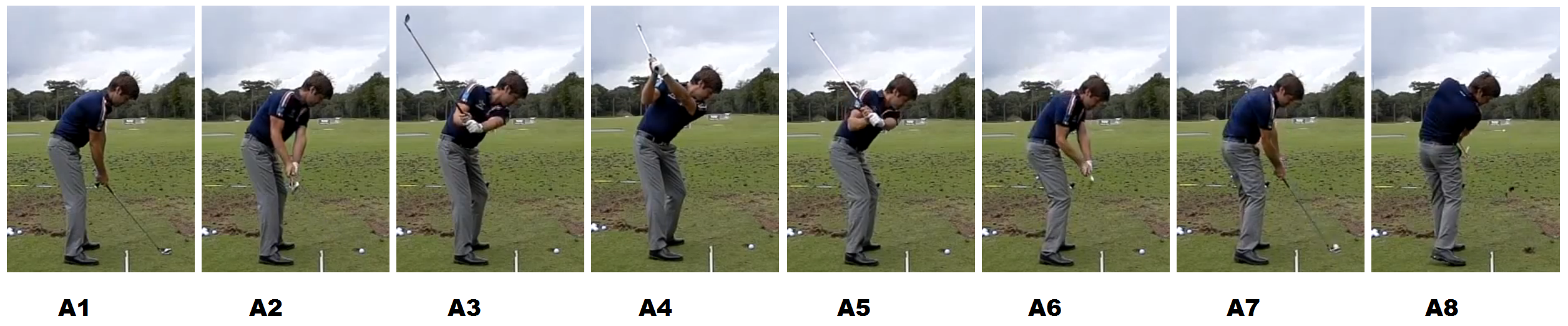 Here is a swing sequence against Grant Waite.  I can see I need a little more knee bend and waist bend at address.  Then have to hit that right elbow bend at A3/A4.  This will create a 'power slot' for that right elbow and club shaft to pass through which is basically above my right thigh - and below my belly.  If you watch videos of Tiger Woods - he does an amazing job of creating that power slot.  I'm trying to get that incorporated into my golf swing.  Which will help me keep the shaft on plane longer and the face should not close as fast through impact.  Should really help me with my finish (A8 to A10).  But I'm not going there until I nail this other first.