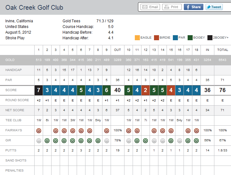 Kind of a funny note... I played with a stranger today at Oak Creek... Really nice guy.  And at the end of the round, he thanked me and said he hasn't had that much fun just 'watching another golfer' swing! I'm not that good...  And I don't like to brag... But it made me smile because I know my hard work is paying off, and my swing is starting to really click.  Hitting my driver the way I did - was amazing.  And I hit nearly ever iron shot solid.  With only a few swings that were slightly off line.