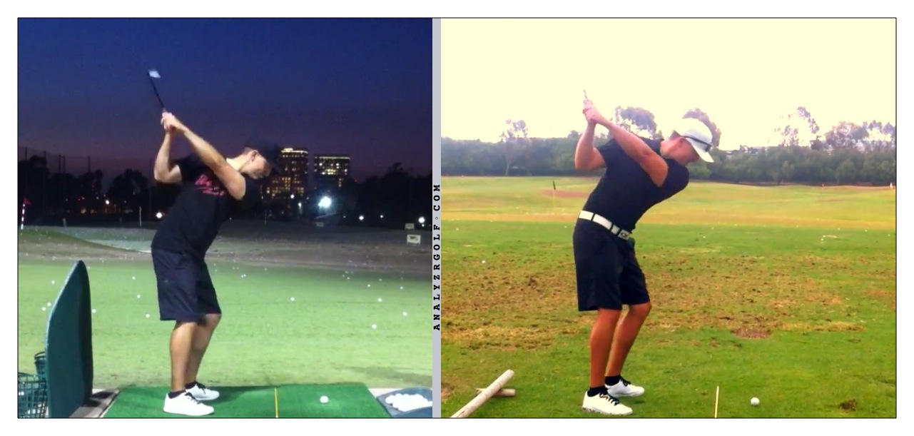 Can't see the club face on the right and the camera angle is a little different but that left wrist looks less palmar flexed on the right.