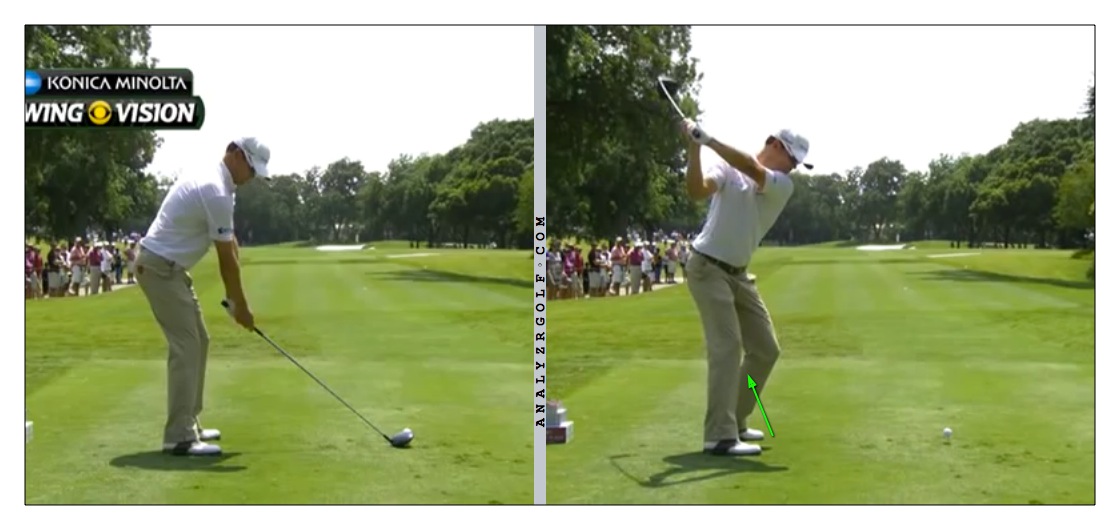 I would say it is hard to gauge how much Phil's left knee is straightening given the camera angle. By the time he reaches the top it looks to me like his left hip has turned back around toward the target so if he is 'sitting' into his left leg you can't really see because the long axis of his thigh bone has rotated back around with the hip to point toward the camera so the thigh is more face on to the camera than it was at address. I think if you viewed this swing from down the line, but behind his foot line his left knee would look a lot more flexed.