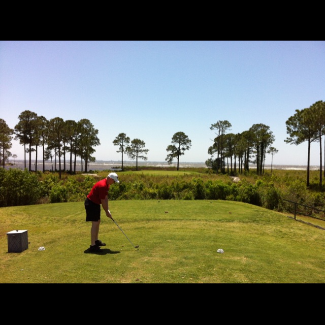 This one is my uncle teeing off on a great par 3 at Bluewater Bay in Destin. It was incredibly tough the day we played, wind was around 30mph all day and it was coming straight off the bay on this hole, but it's a great view.