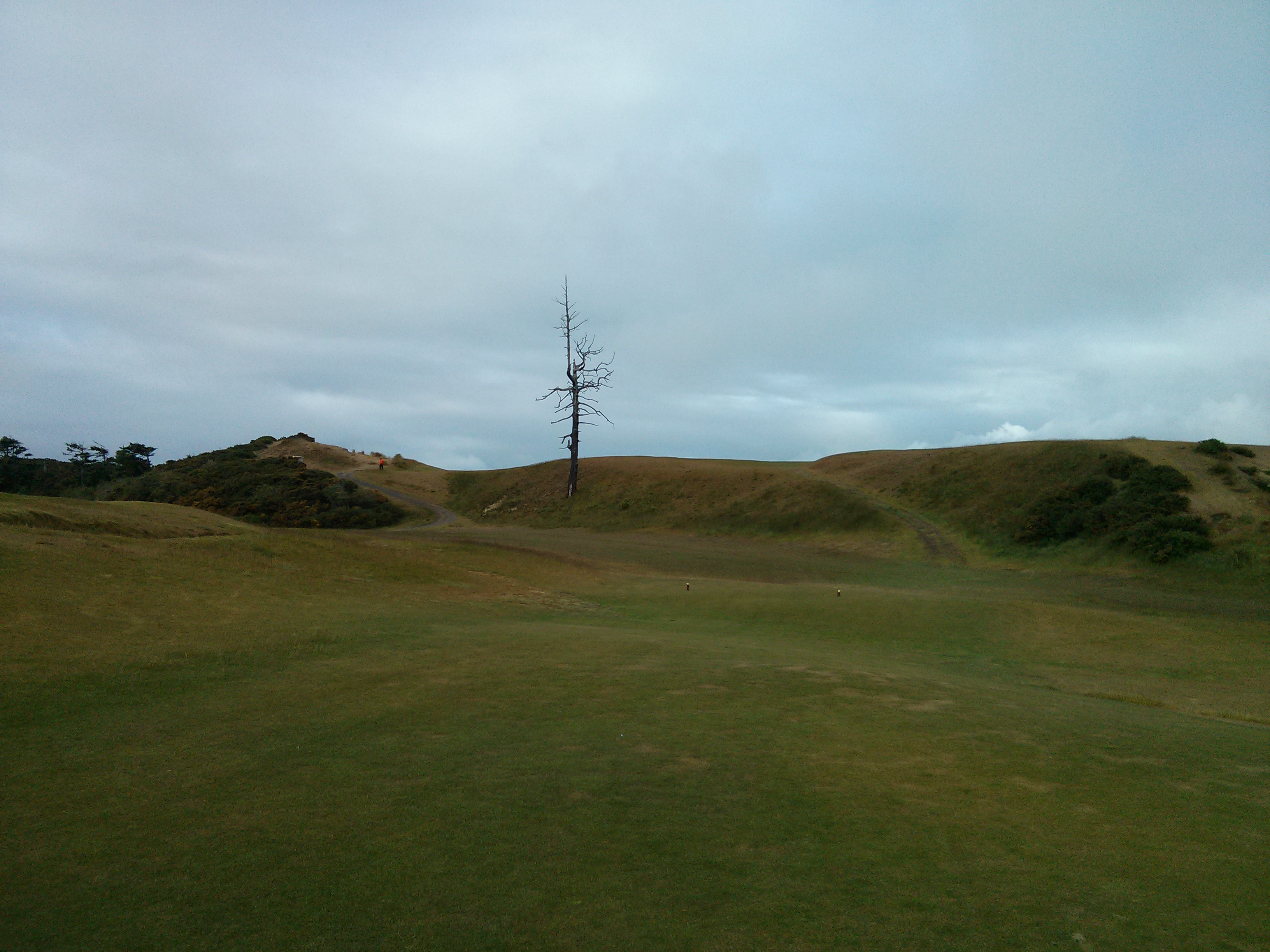 The Tee shot on the third hole at Old Macdonald.  The Best line is just to the left of the tree.  Fortunately, you can still hit it 40 yards to right of the tree and still be on the fairway (I love links golf),  Long second shot though.