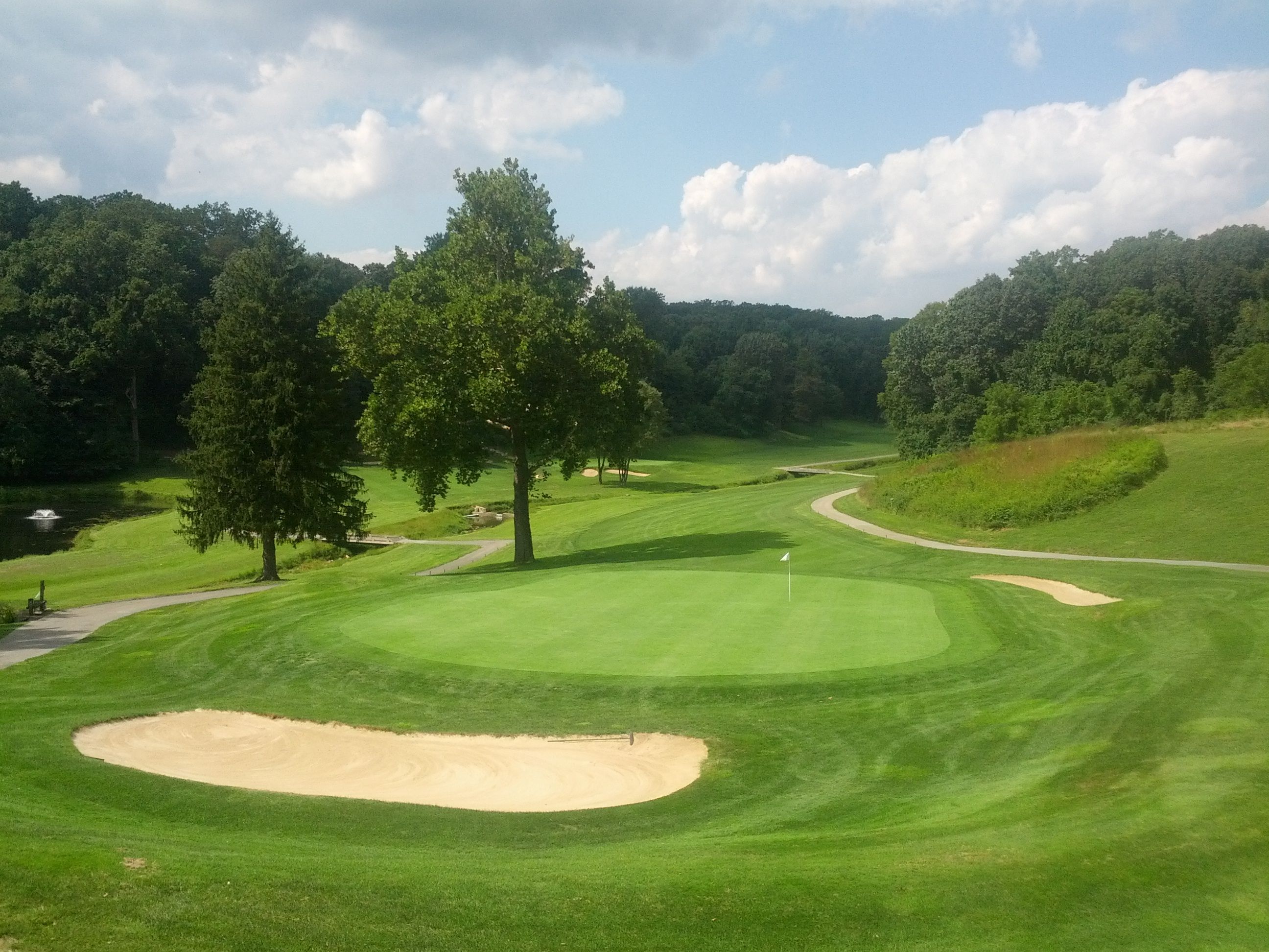 View of the 18th from the bar/restaurant deck at Paxton Hollow Golf Club, in Media, PA (just NW of Philadelphia):