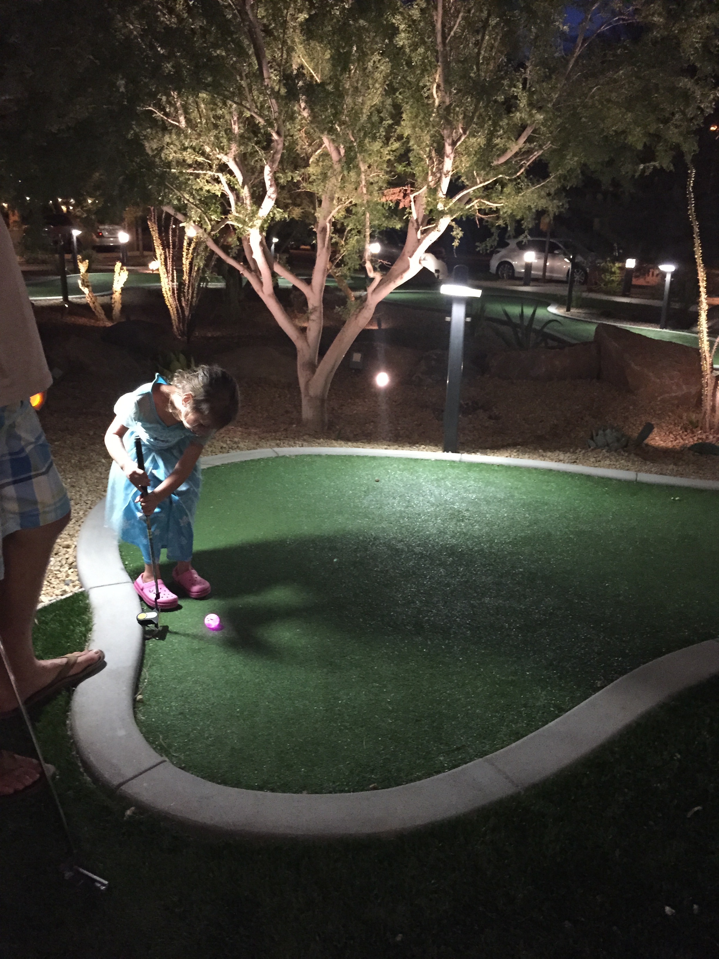 I have to figure this out as well.  The contractor that did our yard didn't do the putting green, which is over on the side yard and similar to your 10x26 green.  The electrical timer for the rear yard lights is right there as well, and they added a conduit that pops out on the opposite side of the green, so it will be easy to have somebody install some lights once I get around to figuring out exactly what I want.