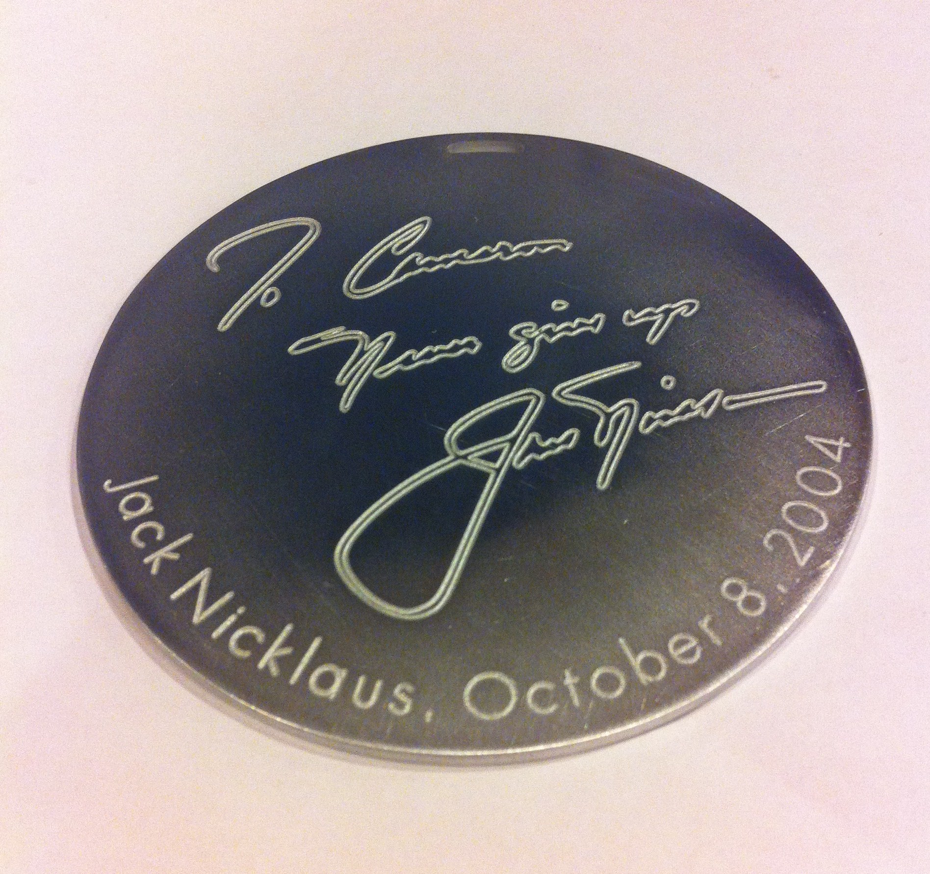 The rear of Cameron's tag has the autograph he received from Jack Nicklaus engraved on the rear.