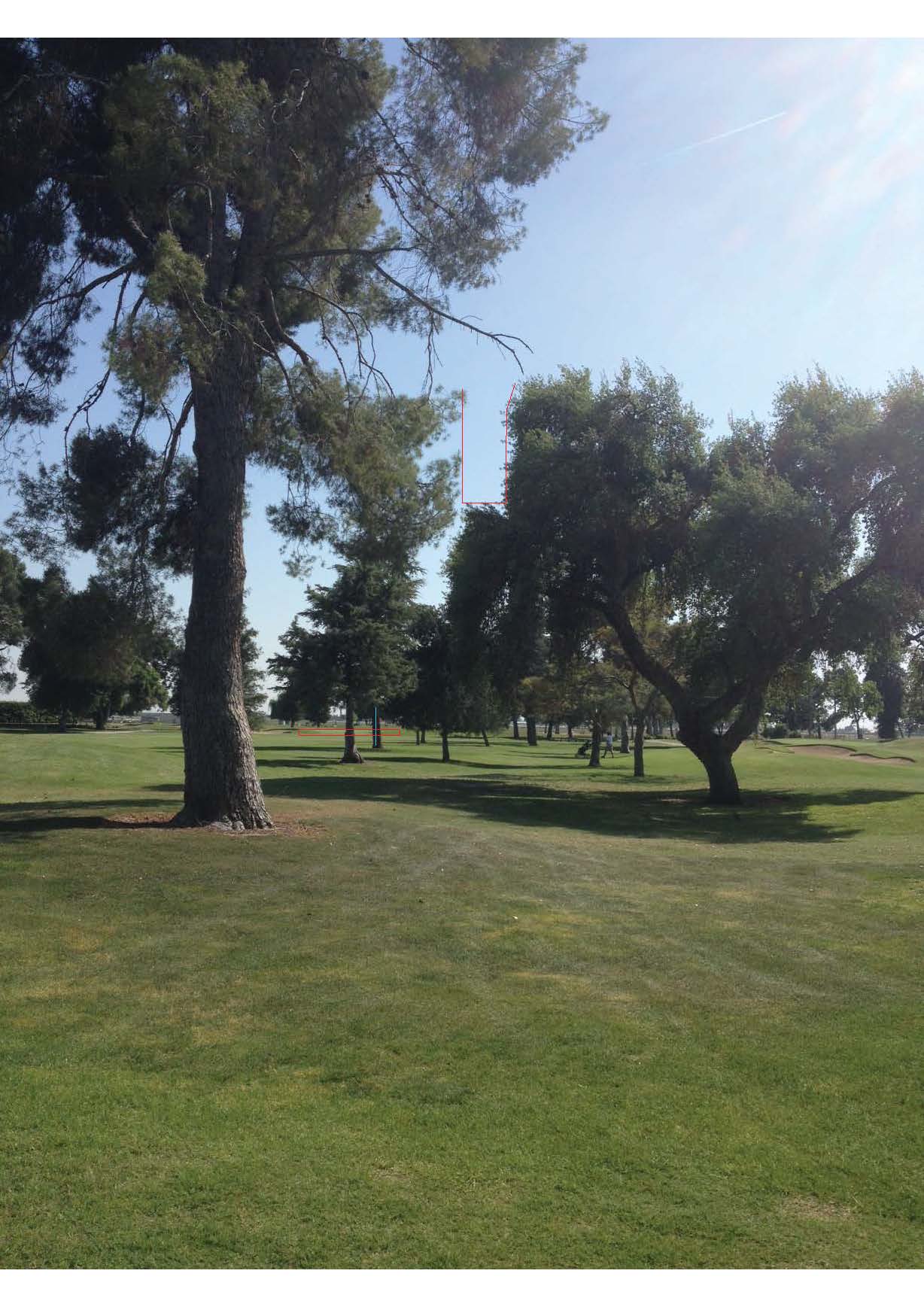 The red "U" at the top were the goal posts, the blue line is the flag and the red box is the extent of the green.  I hit it well but pulled it a teeny bit, heard it clip a leaf, which didn't really affect it much, and it ended up just short of the green, front left. :beer: I "two-putted" for par from there.