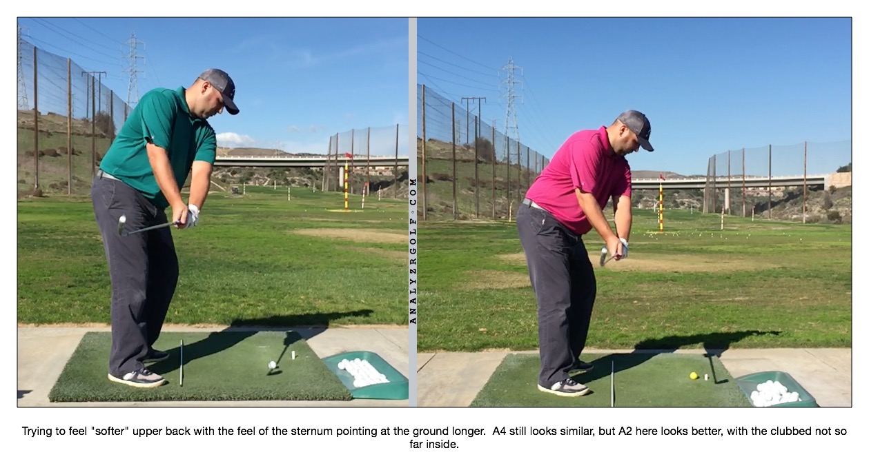 - "Softer" upper back throughout the entire backswing. I also mentioned the feeling of the sternum pointing towards the ground.
