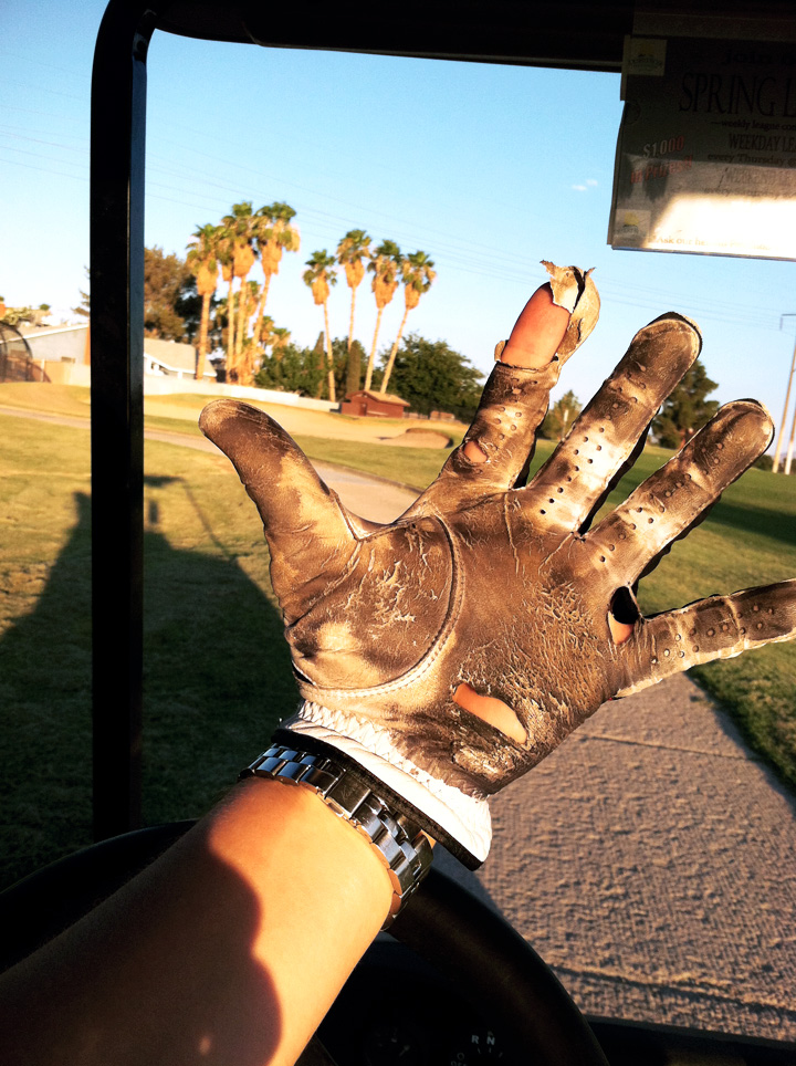 I use to be pretty hard on gloves, always figured it was something about my swing and it was. Now I start out with no glove and go until my hands start feeling a bit torn up. I think playing without a glove has helped me a lot. I don't play much anymore so it's a problem with no calluses built up and humidity can be a problem but I'm liking it. Next I'm thinking of going barefoot
