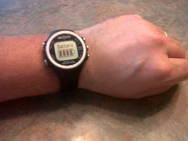I was wondering how a charging cable could be attached to a watch and still maintain a high degree of water resistance.  I don't know how other watch gps manufacturers do that, but ESN simply has a charging "clamp" that attaches to the watch and then plugs into a USB port on a computer.  One side of the clamp has a pad while the other has an alignment tab and pins that fit into slots and contacts on the underside of the watch.  I plan on checking to see if there is an AC adapter that is compatible.  Maybe the ones we use for my kids' ipods?  More on that later.