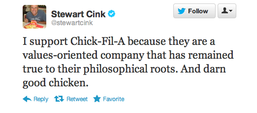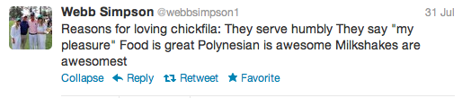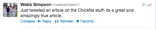 In case you didn't know, yesterday was dubbed national Chick-fil-A appreciation day by Mike Huckabee. Webb Simpson and Stewart Cink tweeted about how much they love the chain restaurant.  Which obviously has a double meaning since the Chick-fil-A's,Dan Cathy, publicly spoke out against same-sex unions two weeks ago.  Whatever their beliefs this was not a smart decision on Cink and Simpson's parts IMO. When you're a sports figure, a brand, better to keep this stuff to yourself and avoid the hassle.  Don't think it's a good idea to polarize yourself.  On the other hand maybe you'll see a Chick-fil-A logo on the side of their hats this week.