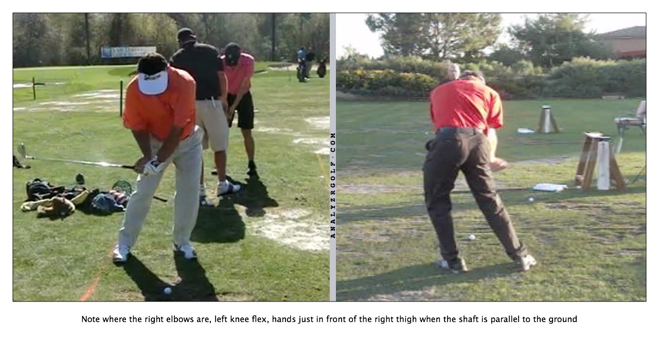 - Elbows separating, might need to feel like they're squeezing together on the downswing.  Gets that right elbow in a better position.  Don't want to see space between the right elbow and your side when the shaft is parallel to the ground on the down swing.