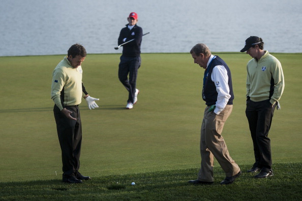 On the par-3 second, in the foursomes format, Rory McIlroy hit his tee shot right of the green and it landed near a sprinkler head. His European partner, Graeme McDowell, requested relief, but American counterpart Jim Furyk disagreed that the sprinkler head interfered with his swing.