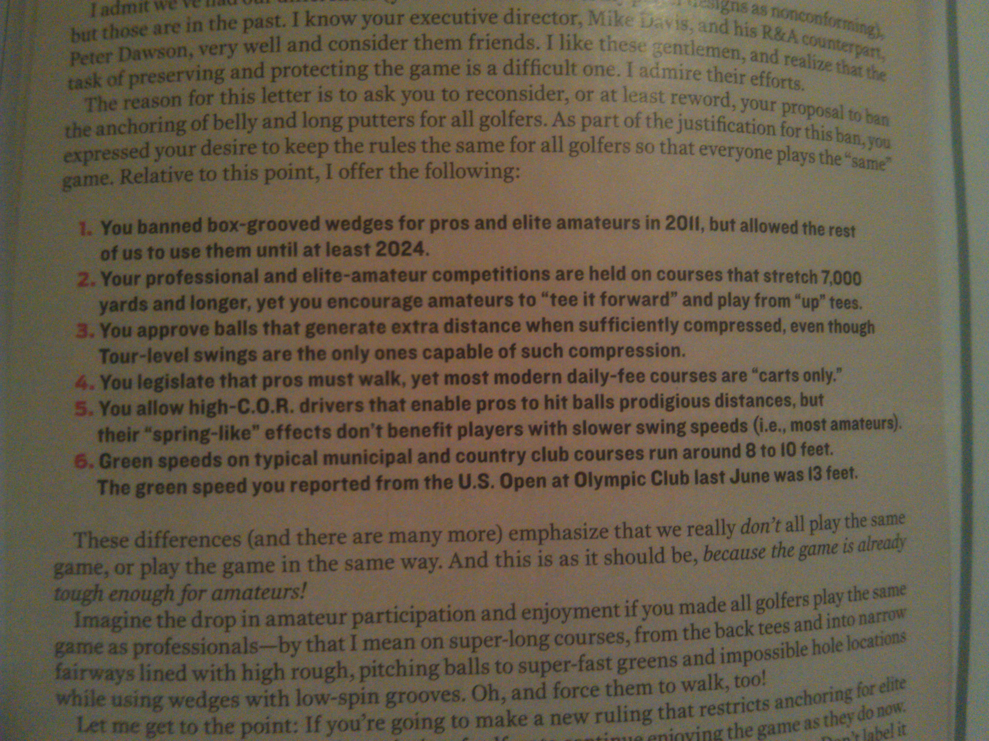 2.  "They're amateurs policing a professional game."  No, dillweed, you're a professional playing a game that's enjoyed by WAY more amateurs than professionals and if you think the USGA should cater to the professionals just because you make your money at it then you don't understand why the USGA exists in the first place.
