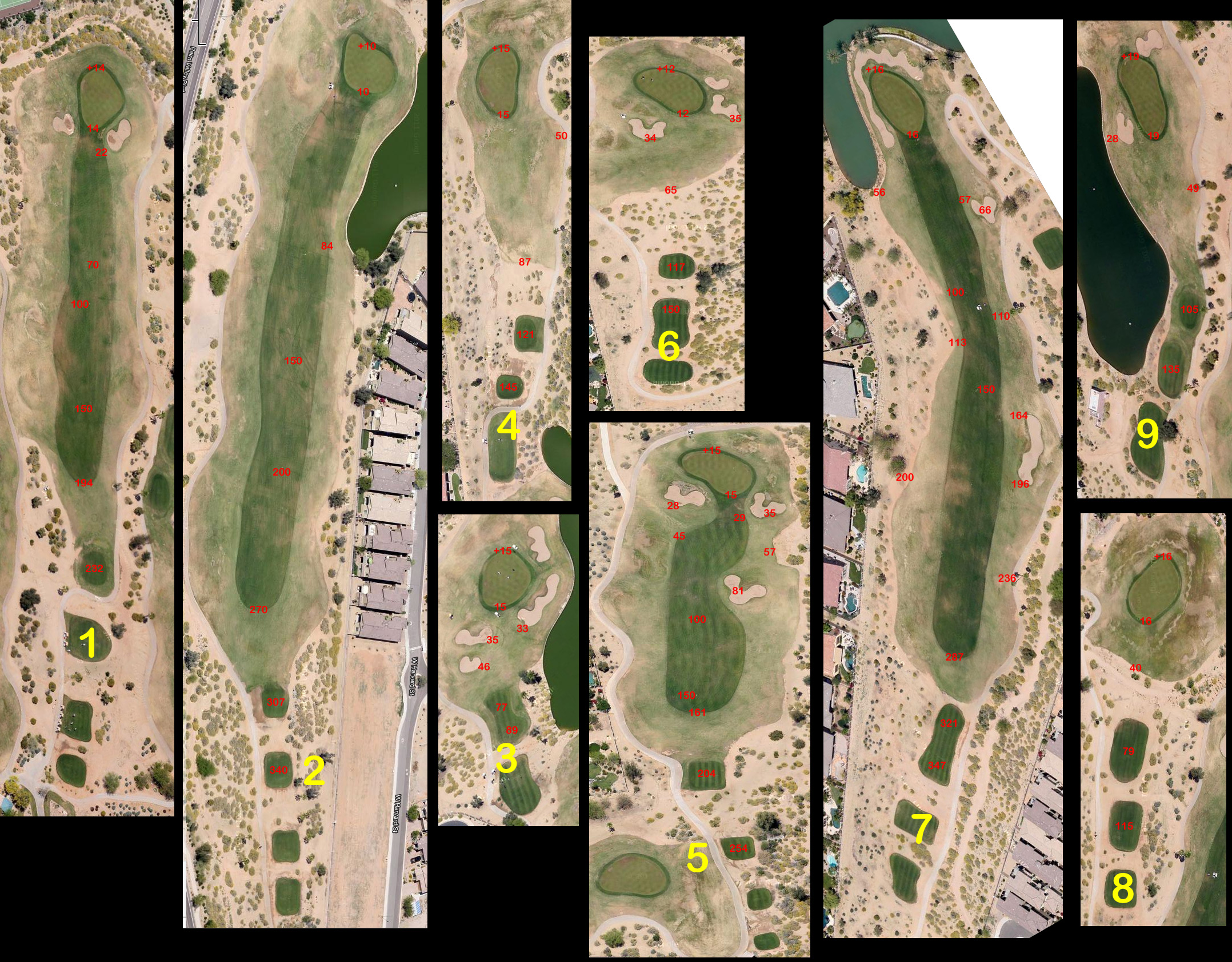 Here's an example (this is the front nine at Palm Valley Lakes Course (Goodyear, AZ).  Yardages are from the center of the green.