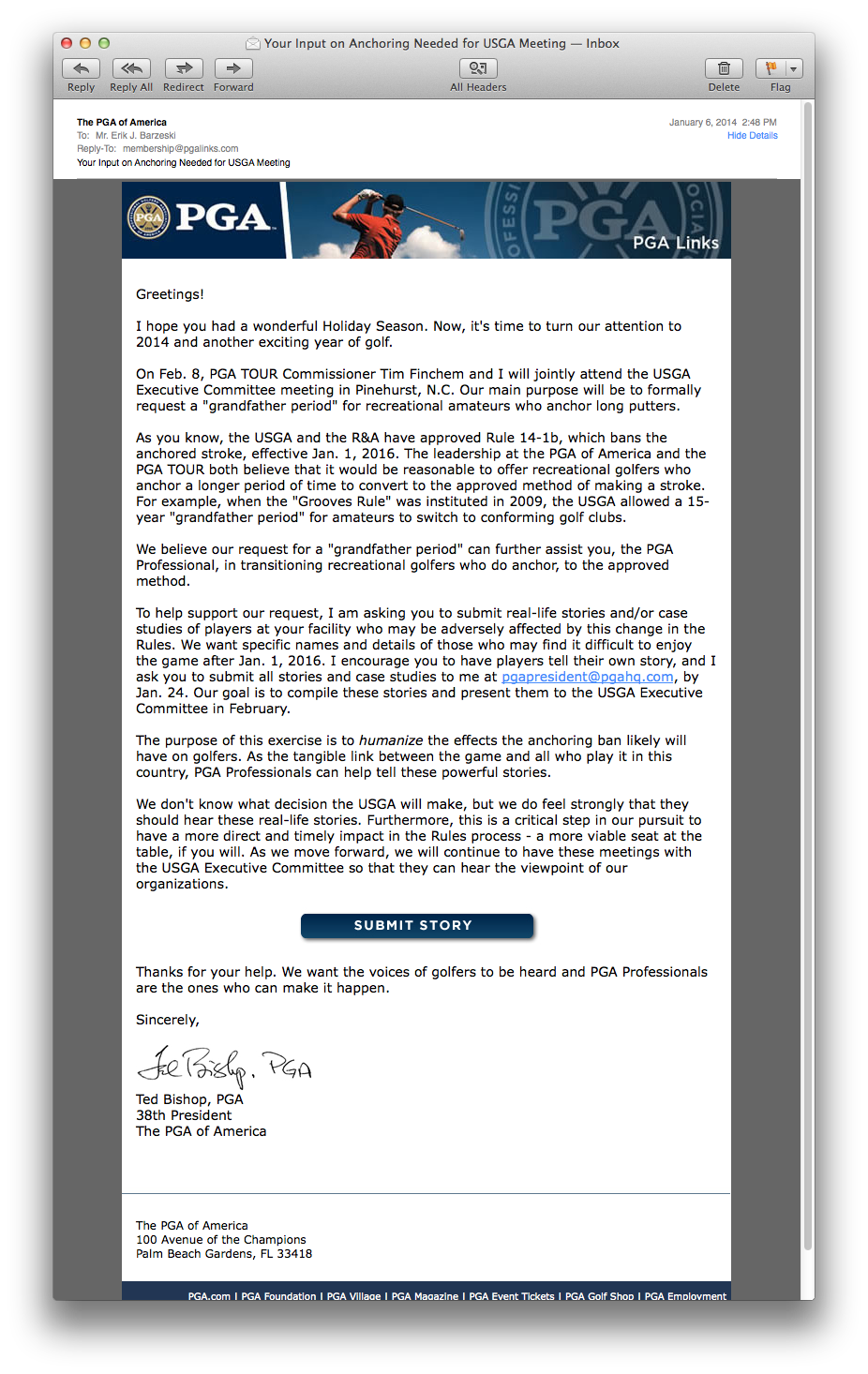 It won't do any good, but I emailed the general PGA address, Joe Bishop, and some others a very short reply saying that I fully support the USGA and the R&A;'s anchoring ban, and directly oppose the PGA's for any actions it takes to delay or oppose the proposed rules change.