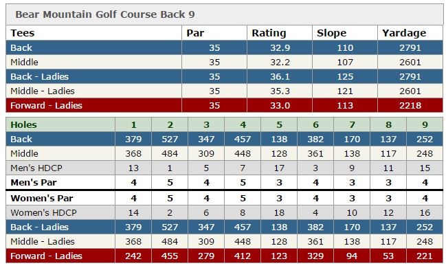 For example, Bear Mountain Golf course (9 hole course in Big Bear Lake, CA) is a close call for me.  Hole # 3 there is a small target to the green which is protected by a stream/gully and thick thickets about 15 yards shy of the green that also has a green side bunker.  From the whites with a decent tee shot I'll be approaching with a PW or SW but from the blues that's a 6i or 7i.  Then hole 7 which is all forced carry over water, I'm looking at my 7i vs. my 4h.  I'm guessing the blues on average would cost me 1 to 2 strokes over nine and the course only gives me for playing the blues .7 in the rating and about another .25 in the slope (with a 18 HI) for a total of about 1 stroke.