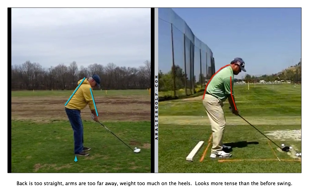 Maybe there was a miscommunication or something.  Like Erik said, back looks straighter and more tense than the before pic.  Review that video or thread and compare these pics.  It's more than just tilting the neck down, it's getting the back to be softer so the arms can hang and not have to be stretched out.  If the back is too straight and the arms are too straight the weight gets on the heels, which can effect the takeaway, the clubhead gets inside the hands and then the arms have to lift to complete the backswing.