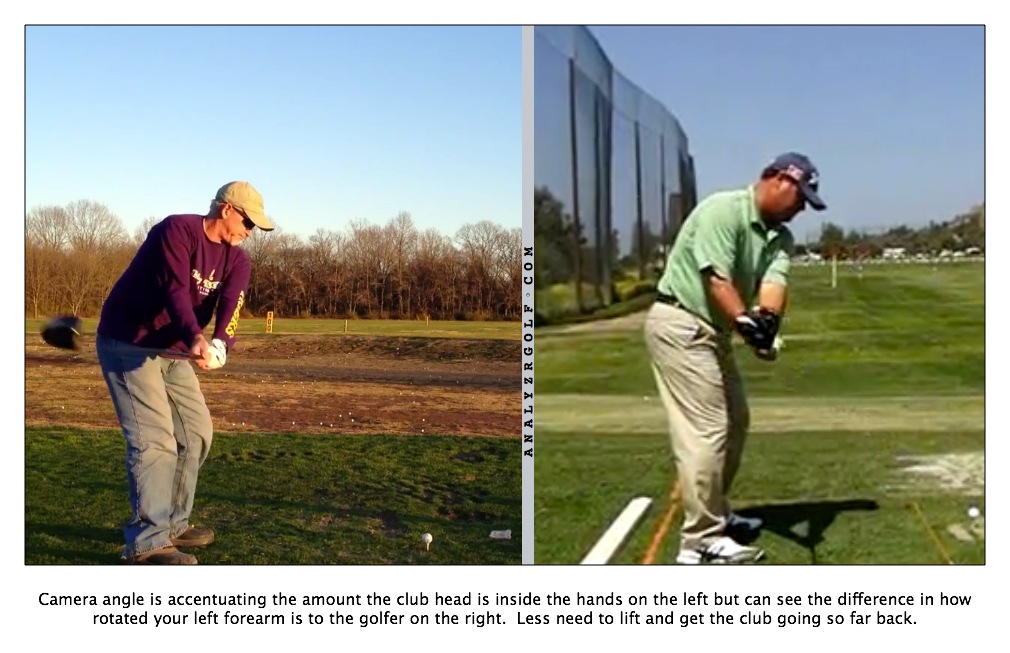 Kind of what we're trying to get at with the set-up adjustments.  When the weight is on the heels, eyes up, the forearms will tend to rotate too much too soon and the club gets inside the hands.  I want to see less forearm rotation and the hands go slightly in, which will keep the club head from rolling inside.  The forearms will rotate less with the better set-up.  To me this is the first step.